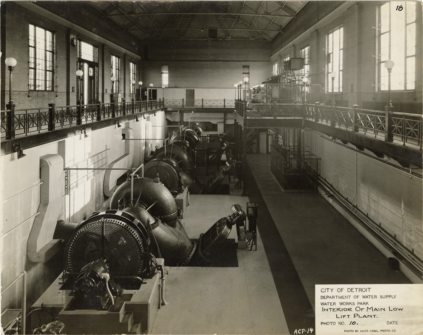 Interior view of low lift plant, Waterworks Park, Detroit water supply system. Printed on front: "City of Detroit. Department of Water Supply. Water Works Park. Interior of main low lift plant. Photo no. 10. Date [blank]. Photo by Amer. Coml. Photo Co."