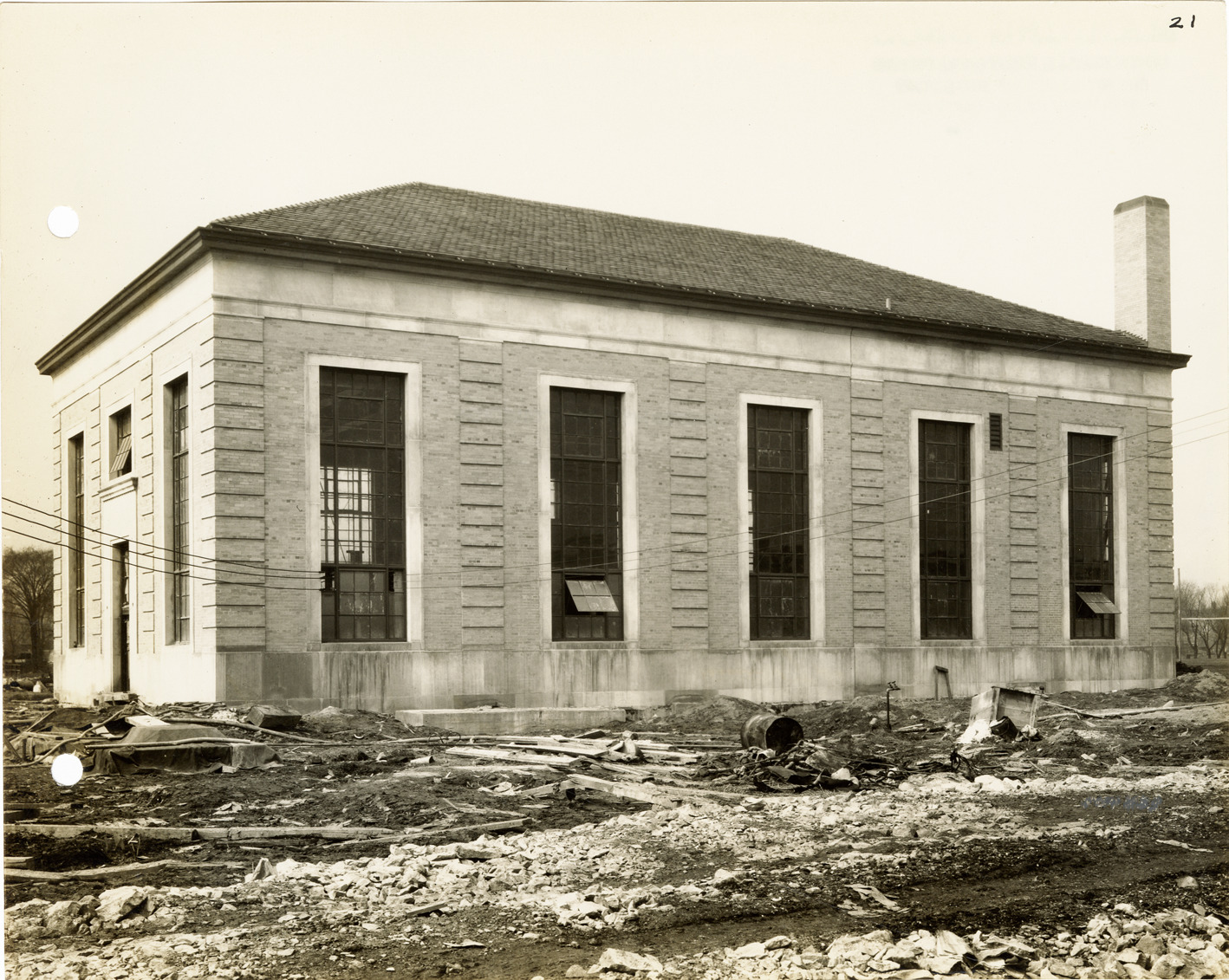 View of auxiliary low lift plant, Waterworks Park, Detroit water supply system. Stamped on back: "Manning Bros., commercial photographers. 504-505 Lincoln Building. Corner State and Park Sts., Detroit, Mich." Handwritten on back: "Aux. low lift pumping station at Water Works Park, April 1930."