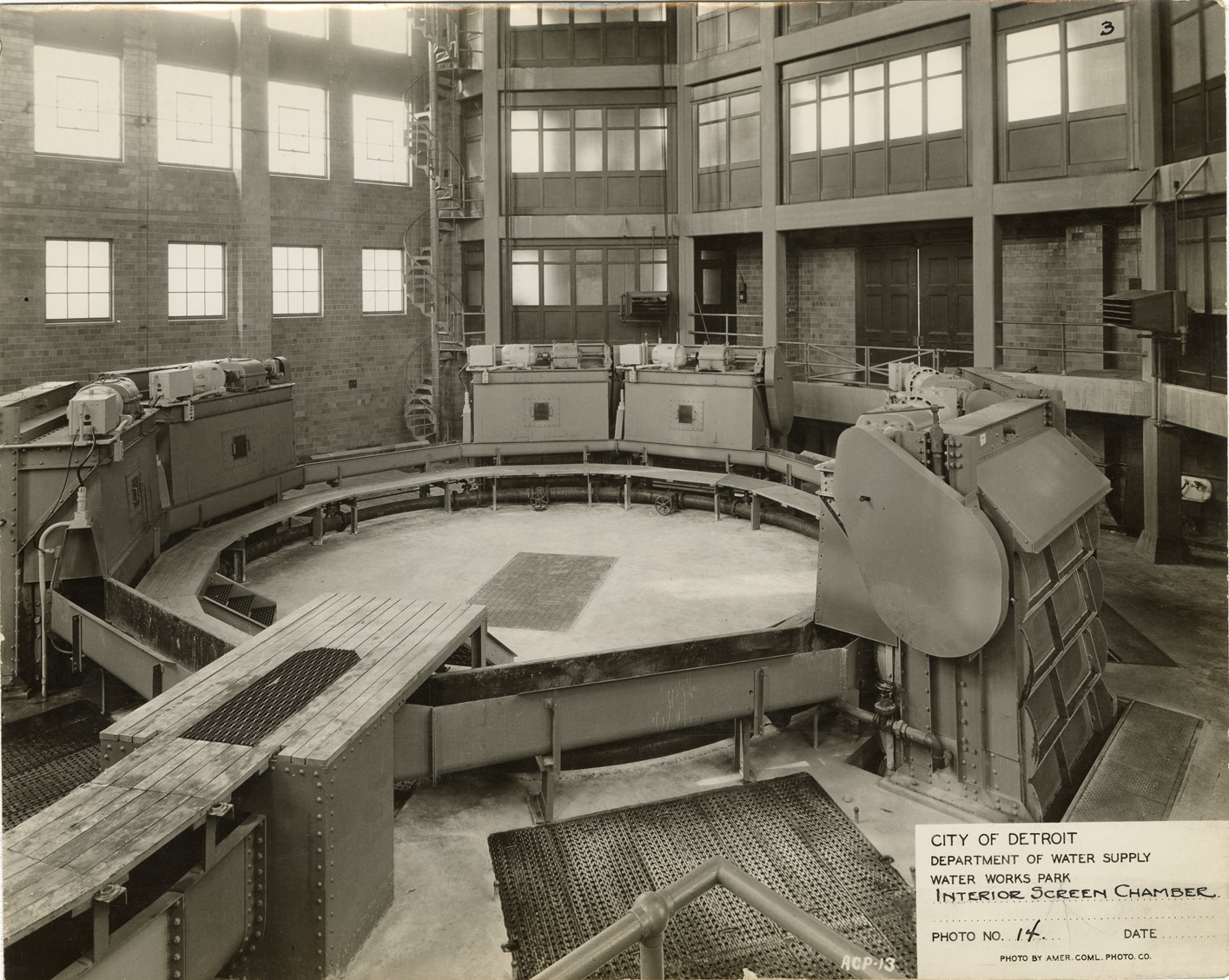 Interior view of the screen chamber, Waterworks Park, Detroit water supply system. Printed on front: "City of Detroit. Department of Water Supply. Water Works Park. Interior screen chamber. Photo no. 14. Date [blank]. Photo by Amer. Coml. Photo Co."