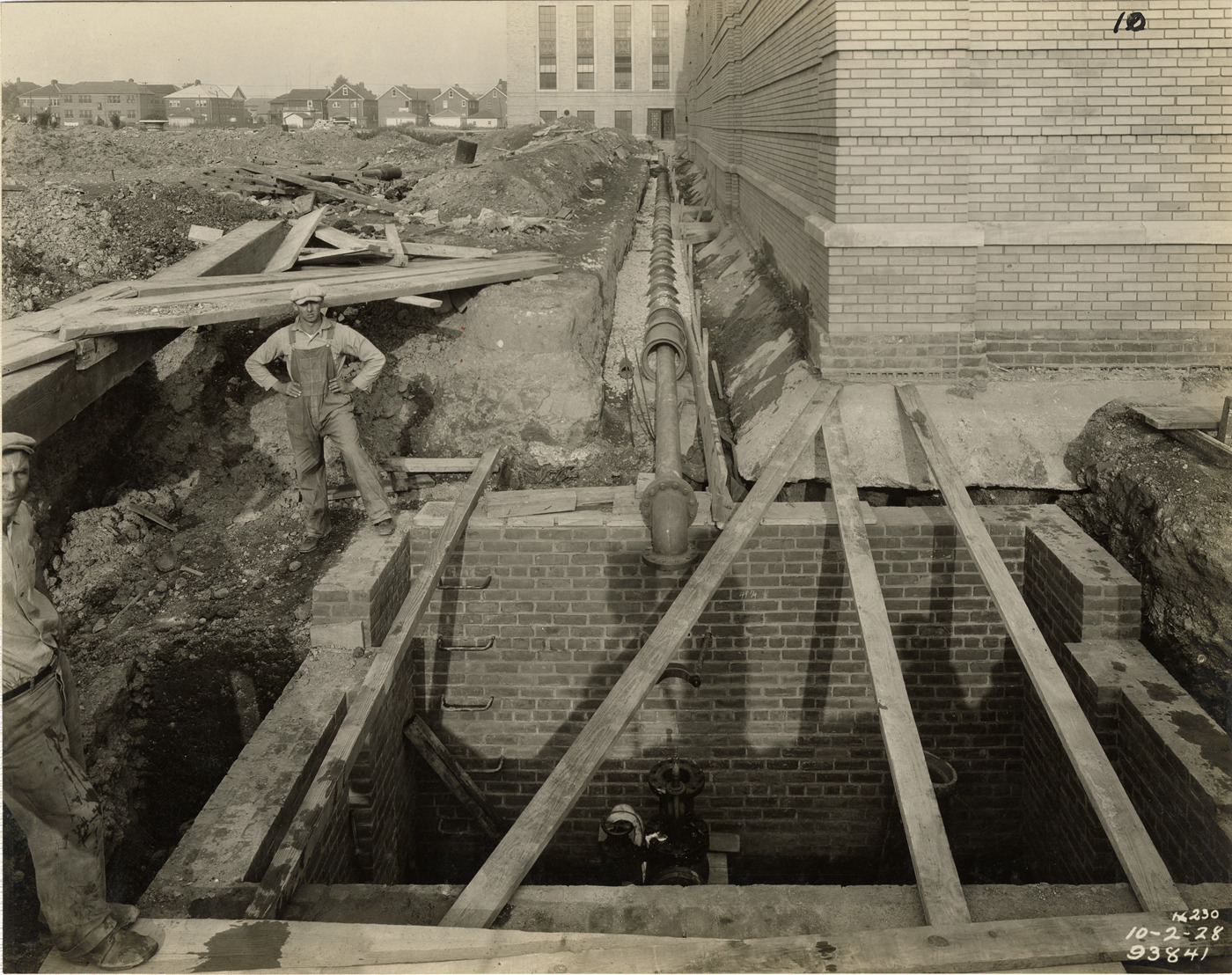 View of two workers posing with steam heating line during construction, Waterworks Park, Detroit water supply system. Printed on front: "10-02-28." Stamped on back: "Manning Bros., commercial photographers. 504-505 Lincoln Building. Corner State and Park Sts., Detroit, Mich." Typed on back: "Water Works Park Sta. Oct. 2, 1928. Manhole no. 3 and steam line to supply filter plant. View looking east."