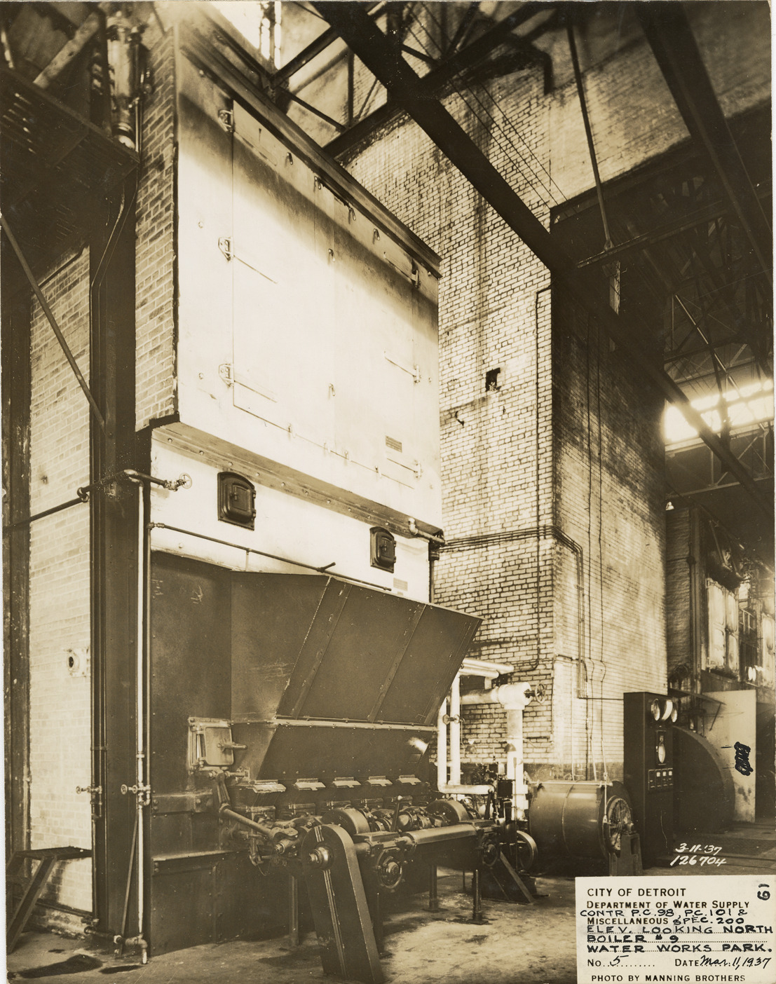 View of boiler no. 9 at pumping station no. 1, Waterworks Park, Detroit water supply system. Printed on front: "City of Detroit. Department of Water Supply. Contr. P.C. 98, P.C. 101 and Spec. 200. Miscellaneous. Elev. looking north, boiler #9, Water Works Park. No. 5. Date: Mar. 11, 1937. Photo by Manning Brothers." Label on back: "This article shows boiler no. 9 of 12 boilers at the Water Works Park Station. This boiler is a Wickes 400 h.p. horizontal cross drum water-tube steam boiler, working pressure of 150 lbs. per square inch, water-heating surface of 4,092 square feet, diameter of steam and water drum 54 inches, equipped with super heater and an economizer." Handwritten on back: "Pumping sta. no. 1."