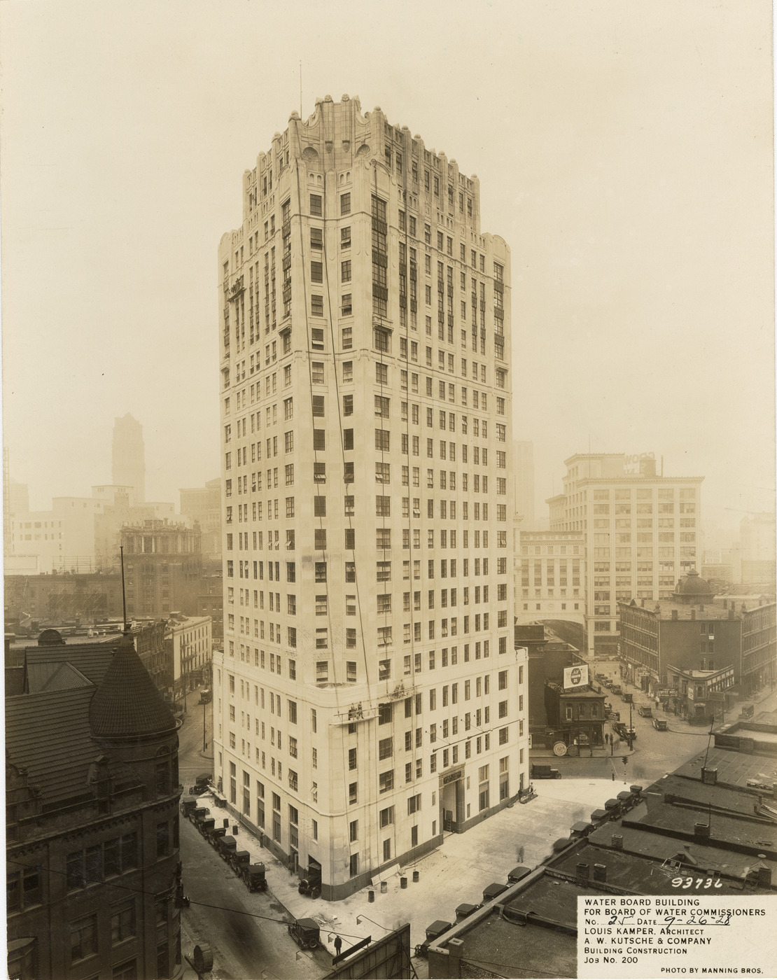 View of Water Board building during construction, Detroit water supply system. Printed on front: "Water Board building for Board of Water Commissioners. No. 25. Date: 9-26-28. Louis Kamper, architect. A.W. Kutsche & Company. Building construction. Job no. 200. Photo by Manning Bros."