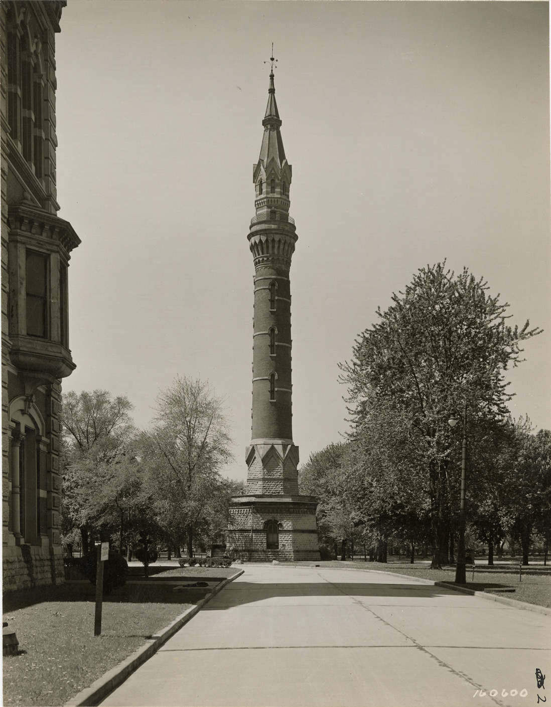 View of water tower at Waterworks Park, Detroit water supply system. Handwritten on back: "Water tower. Water Works Park Station. Erected 1876. Architect: J.E. Sparks, Detroit, Mich. Razed in 1945. P.S. 156. Manning Bros. Inc., photographers."