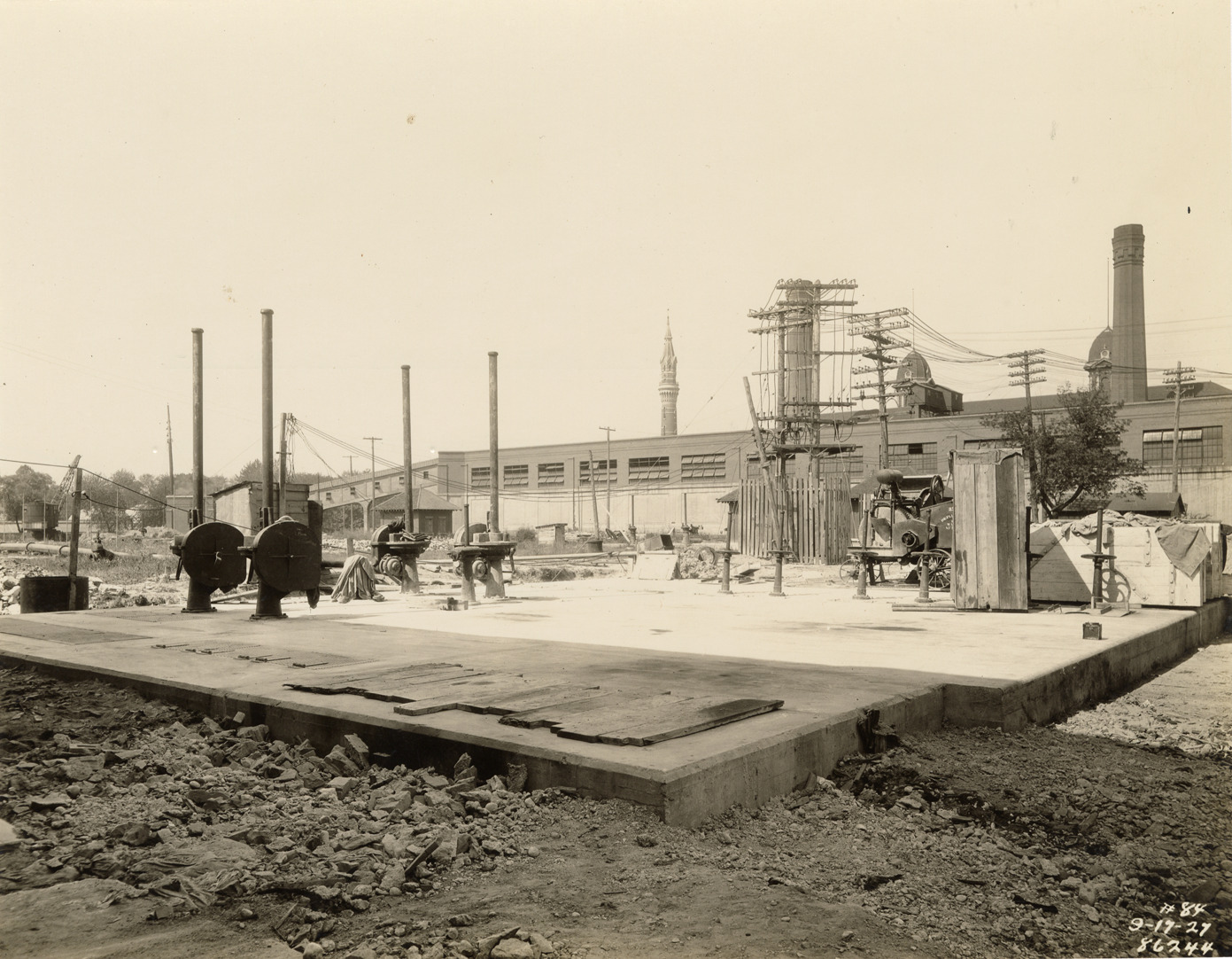 View of Weir chamber during construction at Waterworks Park, Detroit water supply system. Printed on front: "9-17-27." Stamped on back: "Manning Bros., commercial photographers. 504-505 Lincoln Building. Corner State and Park Sts., Detroit, Mich." Typed on back: "A. Phelps and Sons operations at Water Works Park. Contract FC-3. Roof of Weir chamber; sluice gates installed. Stop logs at right."