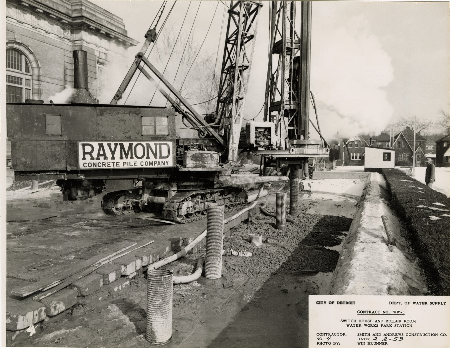 View of pile driver in operation at Waterworks Park, Detroit water supply system. Sign on pile driver reads: "Raymond Concrete Pile Company." Printed on front: "City of Detroit. Dept. of Water Supply. Contract no. WW-3. Switch house and boiler room. Water Works Park Station. Contractor: Smith and Andrews Construction Co. No. 4. Date: 2-2-59. Photo by Winn Brunner." Typed on back: "No. 4. Driving pile casings in col. line 1 near southeast corner of switch house."