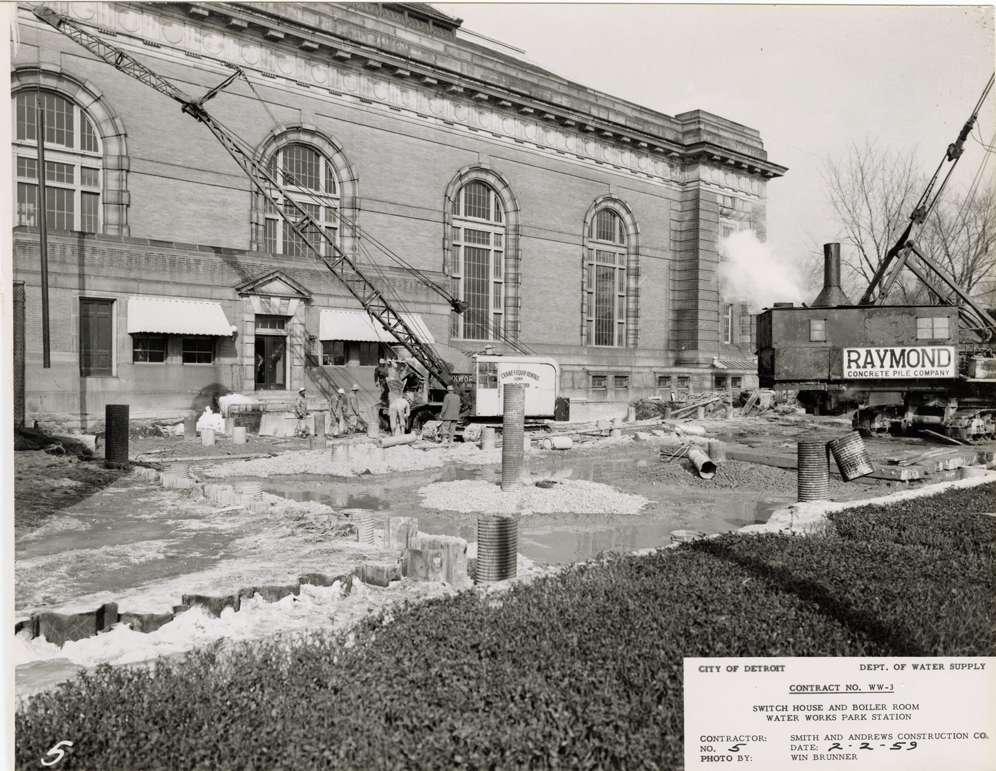 View of workers bailing water from casings, pouring concrete and driving pile casings at Waterworks Park, Detroit water supply system. Crane in background. Sign on pile driver reads: "Raymond Concrete Pile Company." Printed on front: "City of Detroit. Dept. of Water Supply. Contract no. WW-3. Switch house and boiler room. Water Works Park Station. Contractor: Smith and Andrews Construction Co. No. 5. Date: 2-2-59. Photo by Winn Brunner." Typed on back: "No. 5. View looking northeast from southwest corner of site showing three operations in progress: bailing water from casings (left), pouring concrete (center), and driving pile casings (right)."