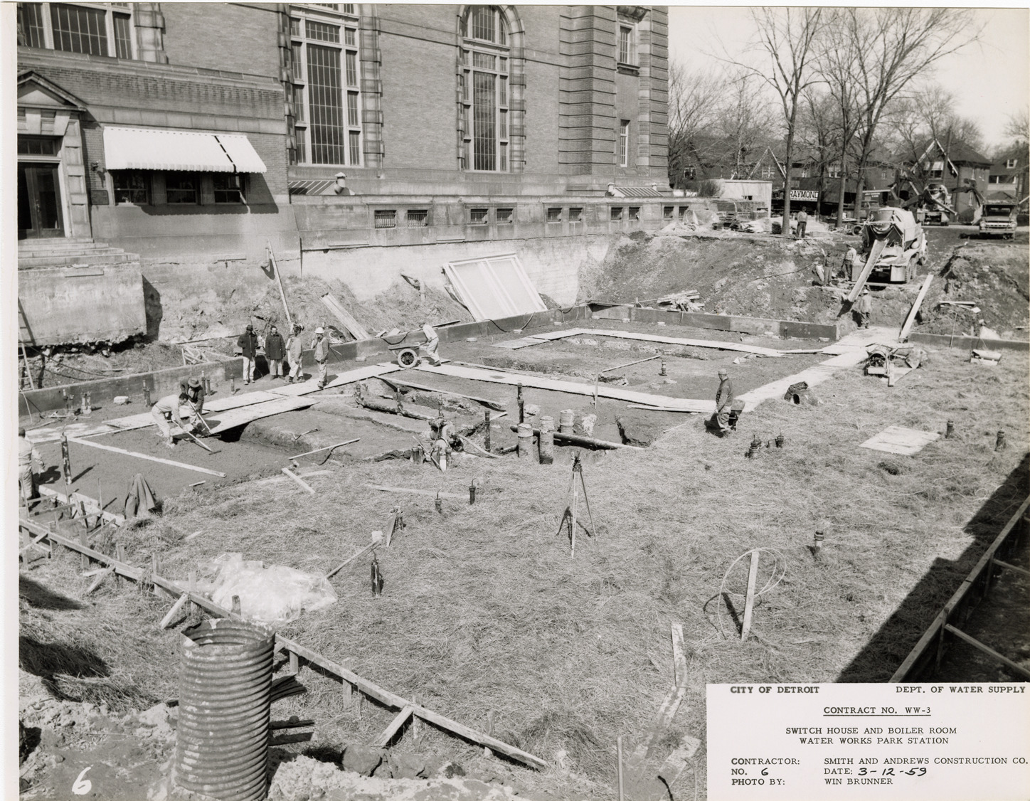 View of workers pouring concrete mud slab at Waterworks Park, Detroit water supply system. Printed on front: "City of Detroit. Dept. of Water Supply. Contract no. WW-3. Switch house and boiler room. Water Works Park Station. Contractor: Smith and Andrews Construction Co. No. 6. Date: 3-12-59. Photo by Winn Brunner." Typed on back: "No. 6. Pouring concrete mud slab in north half of boiler room basement. View looking northeast from southwest corner of excavation."