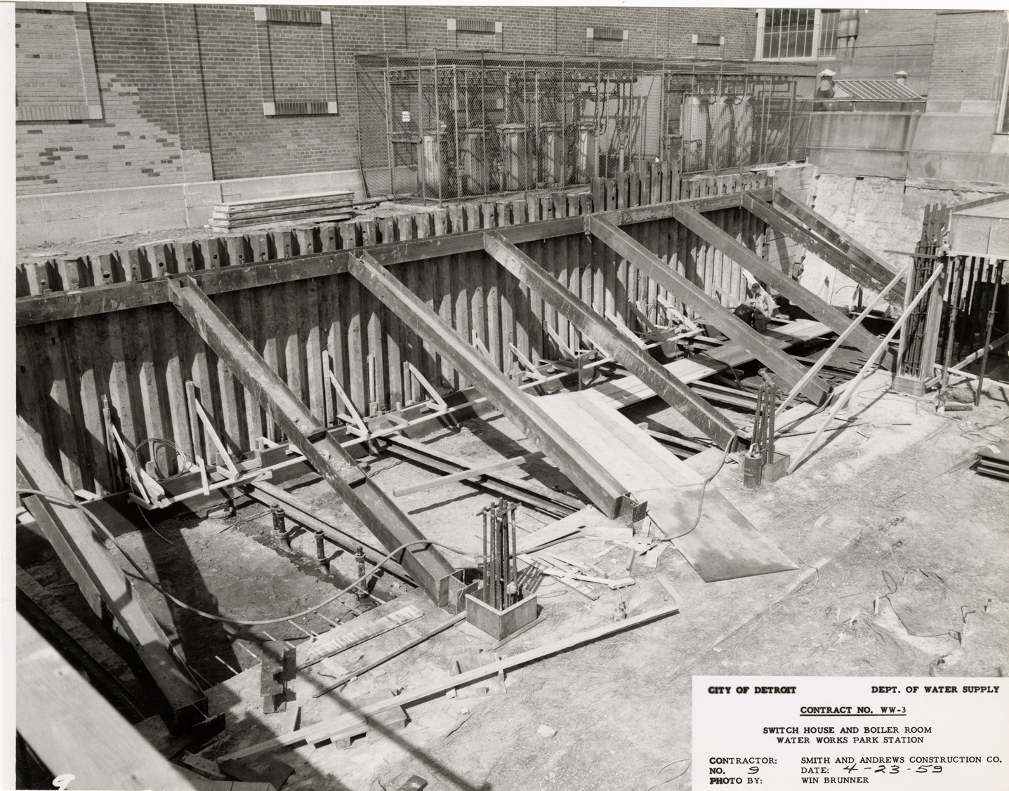 View of sheet piling on foundation slab at Waterworks Park, Detroit water supply system. Printed on front: "City of Detroit. Dept. of Water Supply. Contract no. WW-3. Switch house and boiler room. Water Works Park Station. Contractor: Smith and Andrews Construction Co. No. 9. Date: 4-23-59. Photo by Winn Brunner." Typed on back: "No. 9. Sheet piling and bracing at west end of foundation slab of boiler room. View looking northwest."
