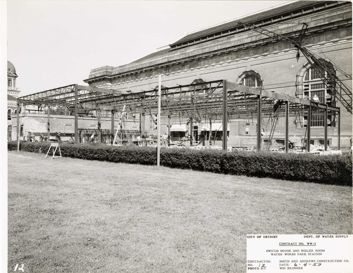 View of structural framework for boiler room and switch house at Waterworks Park, Detroit water supply system. Printed on front: "City of Detroit. Dept. of Water Supply. Contract no. WW-3. Switch house and boiler room. Water Works Park Station. Contractor: Smith and Andrews Construction Co. No. 12. Date: 6-4-59. Photo by Winn Brunner." Typed on back: "No. 12. Erecting structural steel superstructure. View looking northwest."