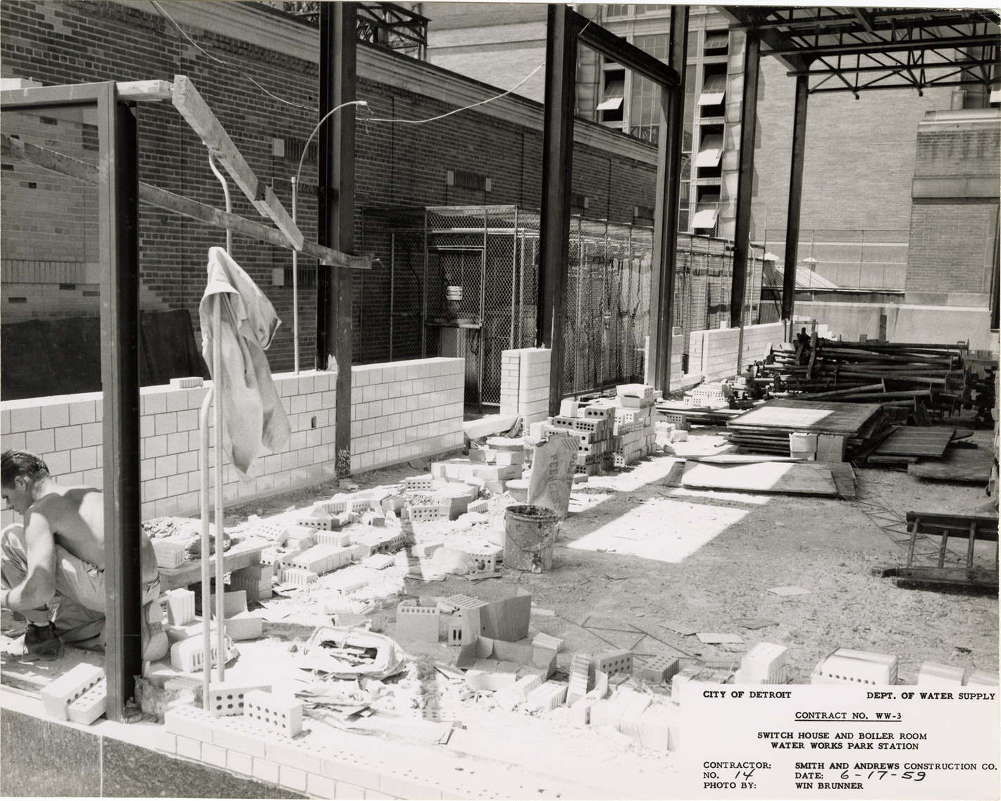 View of worker laying tile for west wall of boiler room at Waterworks Park, Detroit water supply system. Printed on front: "City of Detroit. Dept. of Water Supply. Contract no. WW-3. Switch house and boiler room. Water Works Park Station. Contractor: Smith and Andrews Construction Co. No. 14. Date: 6-17-59. Photo by Winn Brunner." Typed on back: "No. 14. Facing tile in west wall of boiler room."