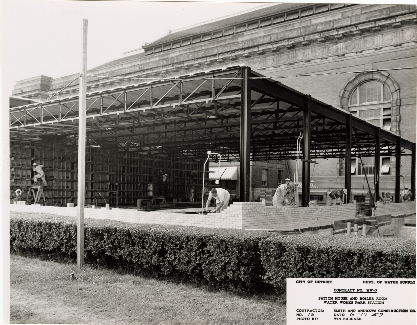 View of workers laying brick for switch house at Waterworks Park, Detroit water supply system. Printed on front: "City of Detroit. Dept. of Water Supply. Contract no. WW-3. Switch house and boiler room. Water Works Park Station. Contractor: Smith and Andrews Construction Co. No. 15. Date: 6-17-59. Photo by Winn Brunner." Typed on back: "No. 15. Laying face brick at southeast corner of switch house."
