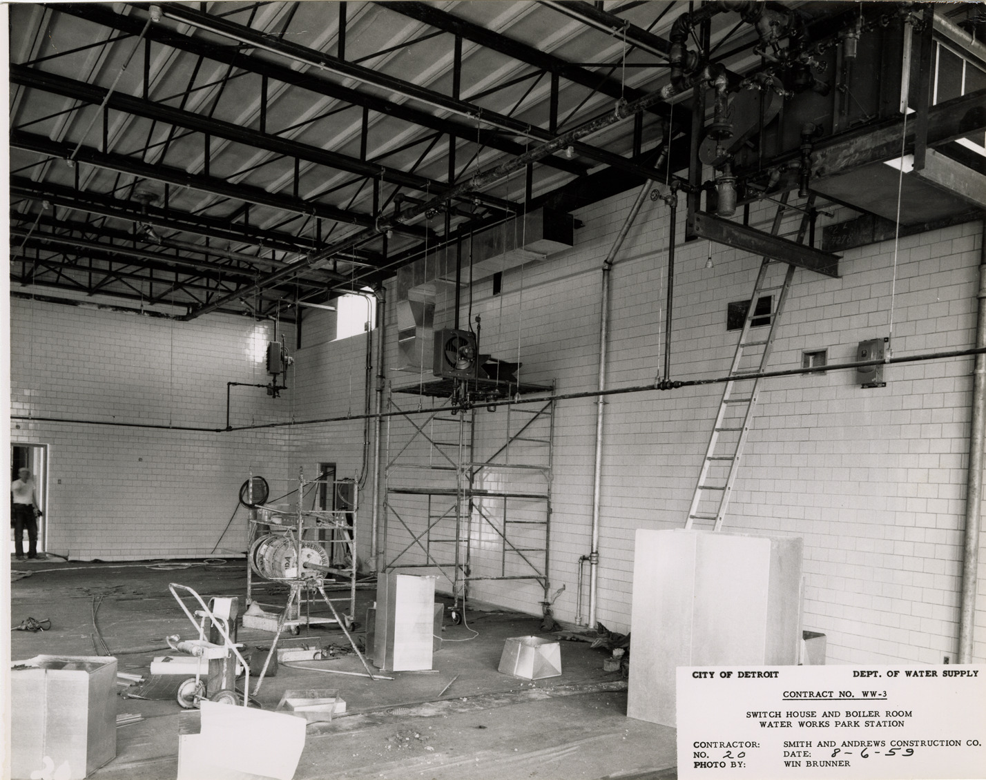 Interior view of boiler room at Waterworks Park, Detroit water supply system. Printed on front: "City of Detroit. Dept. of Water Supply. Contract no. WW-3. Switch house and boiler room. Water Works Park Station. Contractor: Smith and Andrews Construction Co. No. 20. Date: 8-6-59. Photo by Winn Brunner." Typed on back: "No. 20. Interior view of boiler room showing condensate piping, unit heaters, ductwork, etc."