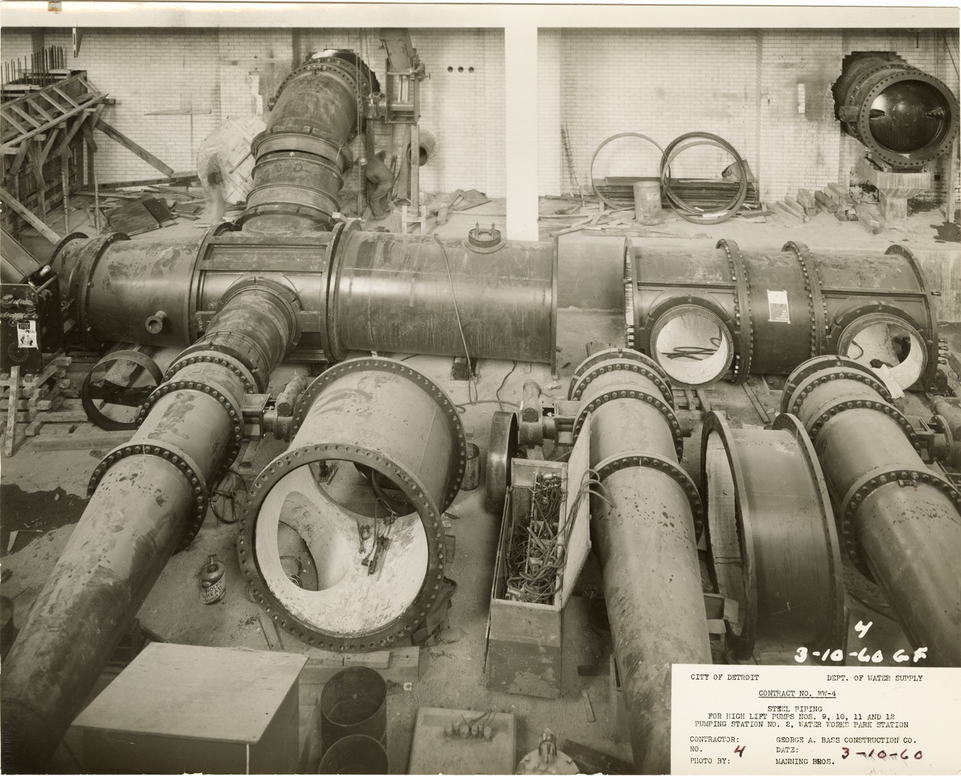 View of assembly of discharge pipes at Waterworks Park, Detroit water supply system. Printed on front: "City of Detroit. Dept. of Water Supply. Contract no. WW-4. Steel piping for high lift pumps nos. 9, 10, 11 and 12. Pumping station no. 2. Water Works Park Station. Contractor: George A. Bass Construction Co. No. 4. Date: 3-10-60. Photo by Manning Bros." Typed on back: "Looking north at assembly of discharge piping and header."