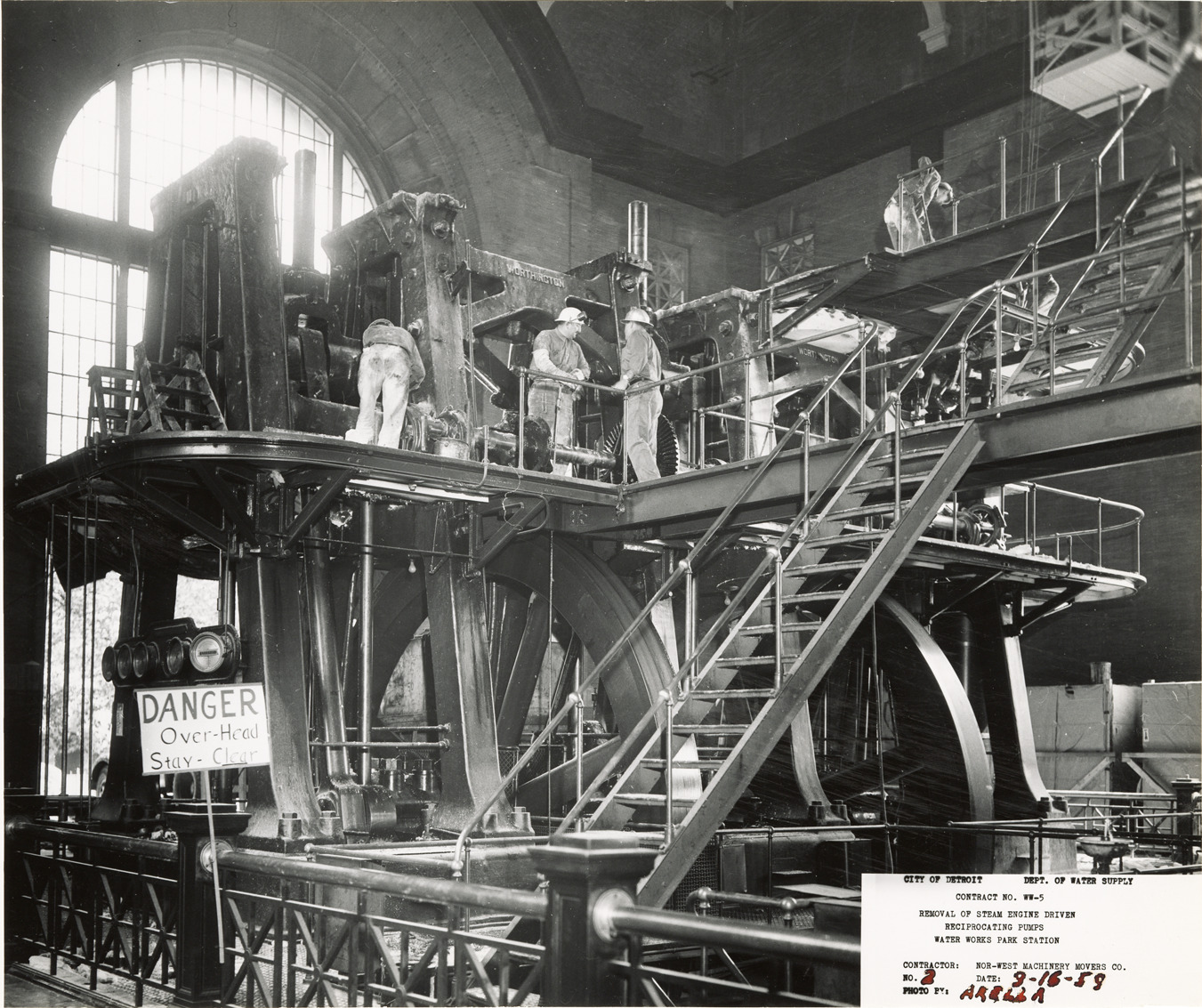 Workers disassembling pump no. 13, Waterworks Park, Detroit water supply system