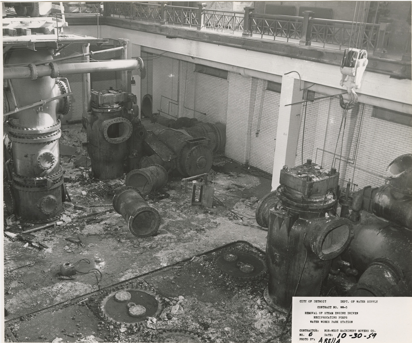 View of disassembly of pump no. 12 and no. 13 at Waterworks Park, Detroit water supply system. Printed on front: "City of Detroit. Dept. of Water Supply. Contract no. WW-5. Removal of steam engine driven reciprocating pumps. Water Works Park Station. Contractor: Nor-West Machinery Movers Co. No. 6. Date: 10-30-59. Photo by Arella." Typed on back: "No. 6. Pumping station no. 2. Pumps no. 12 and 13. Pump and miscellaneous piping being removed."