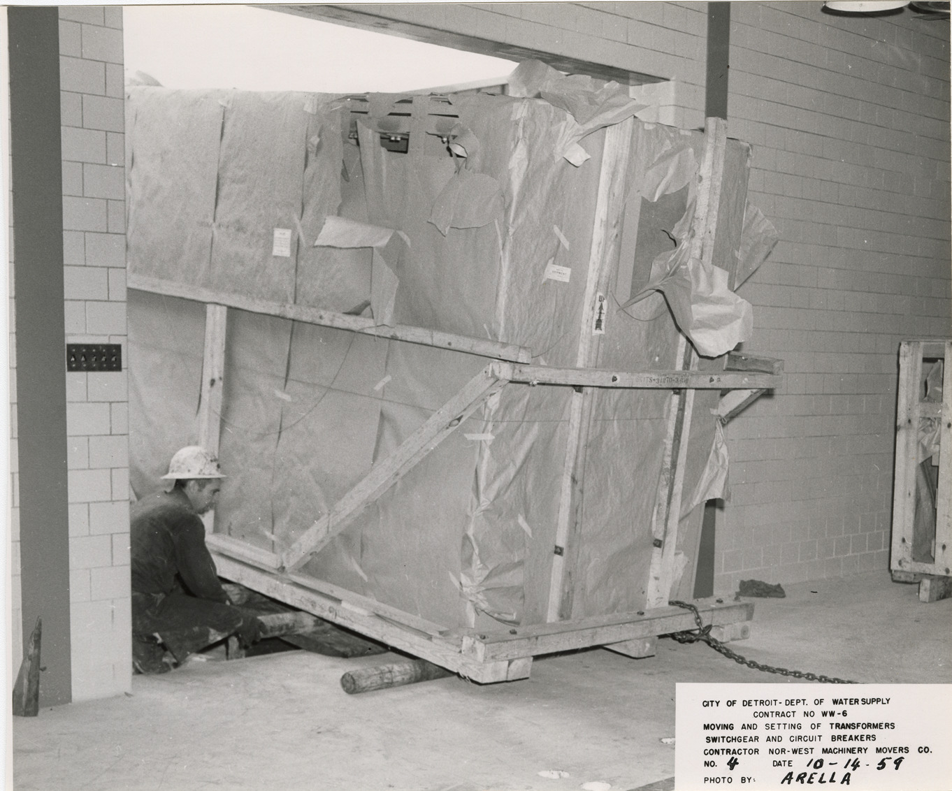 View of worker rolling metal clad switchgear into switch house at Waterworks Park, Detroit water supply system. Printed on front: "City of Detroit. Dept. of Water Supply. Contract no. WW-6. Moving and setting of transformers, switchgear and circuit breakers. Contractor: Nor-West Machinery Movers Co. No. 4. Date: 10-14-59. Photo by Arella." Typed on back: "No. 4. Rolling one section of metal clad switchgear into the switch house."