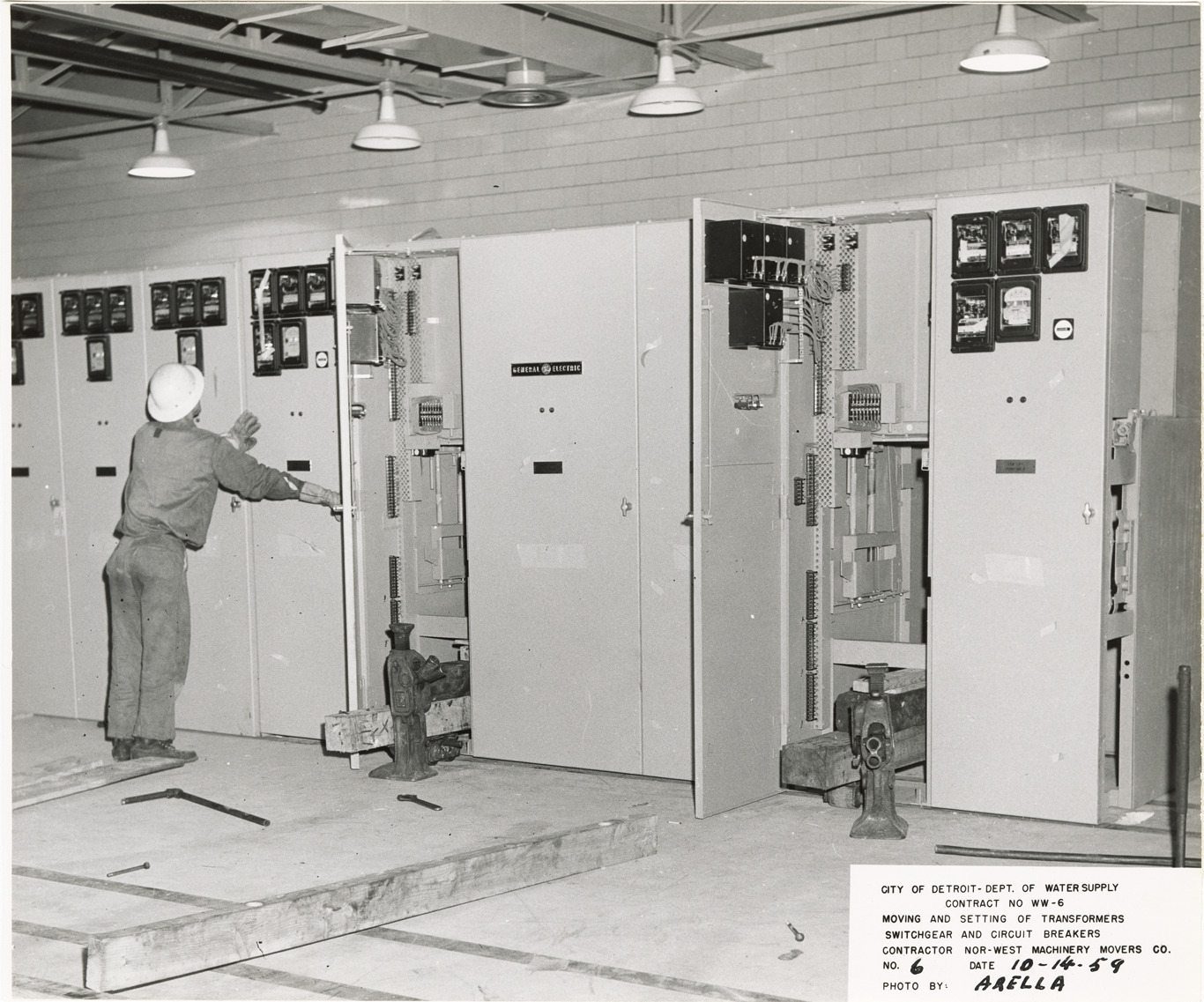 View of a worker setting metal clad switchgear in place at Waterworks Park, Detroit water supply system. Printed on front: "City of Detroit. Dept. of Water Supply. Contract no. WW-6. Moving and setting of transformers, switchgear and circuit breakers. Contractor: Nor-West Machinery Movers Co. No. 6. Date: 10-14-59. Photo by Arella." Typed on back: "No. 6. Setting one section of metal clad switchgear in place."