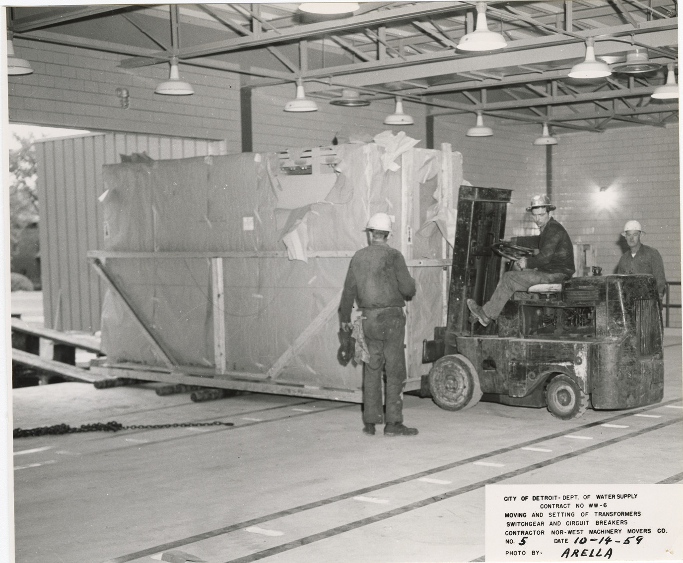 View of workers moving metal clad switchgear with forklift at Waterworks Park, Detroit water supply system. Printed on front: "City of Detroit. Dept. of Water Supply. Contract no. WW-6. Moving and setting of transformers, switchgear and circuit breakers. Contractor: Nor-West Machinery Movers Co. No. 5. Date: 10-14-59. Photo by Arella." Typed on back: "No. 5. Moving the metal clad switchgear across the switch house floor."