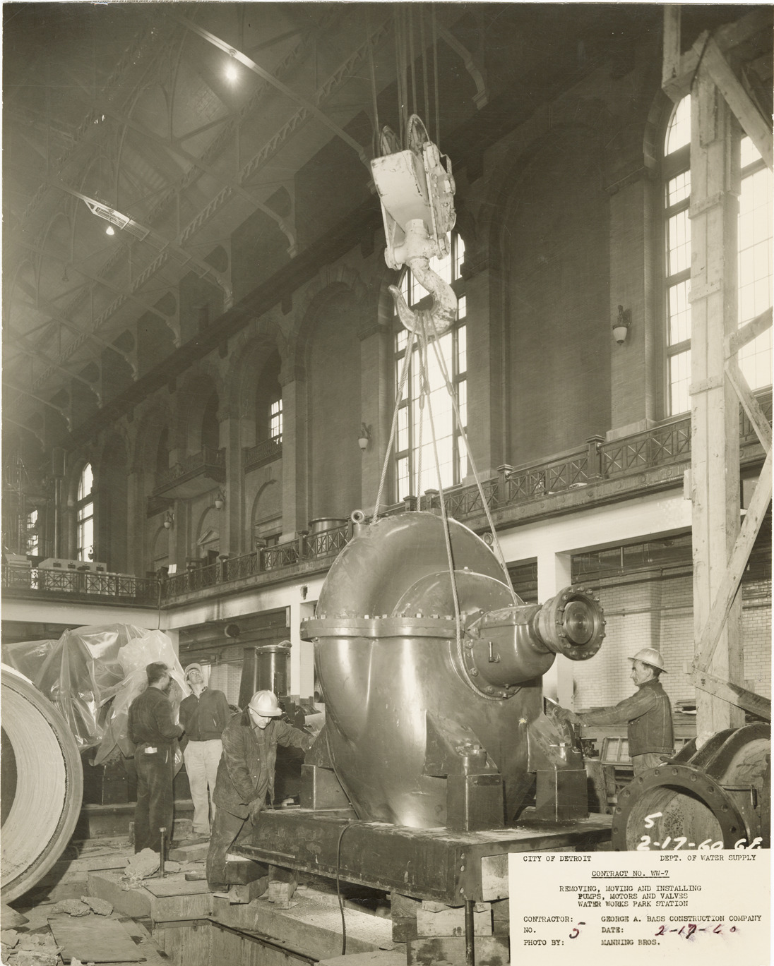 View of workers setting pump no. 11 on foundation with hoist, pumping station no. 2, Waterworks Park, Detroit water supply system. Printed on front: "City of Detroit. Dept. of Water Supply. Contract no. WW-7. Removing, moving and installing pumps, motors and valves. Water Works Park Station. Contractor: George A. Bass Construction Co. No. 5. Date: 2-17-60. Photo by Manning Bros." Typed on back: "Photograph no. 5. Pumping station no. 2. Setting pump no. 11 on foundation."