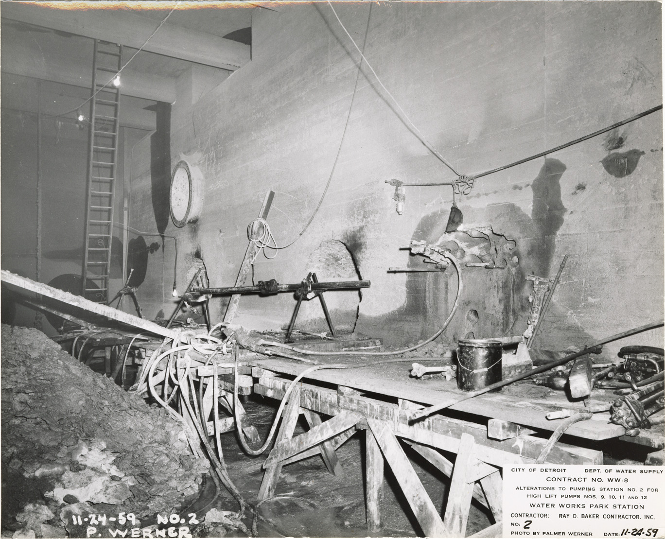 View of holes for new suction pumps, pumping station no. 2, Waterworks Park, Detroit water supply system. Printed on front: "City of Detroit. Dept. of Water Supply. Contract no. WW-8. Alterations to pumping station no. 2 for high lift pumps nos. 9, 10, 11 and 12. Water Works Park Station. Contractor: Ray D. Baker contractor, Inc. No. 2. Date: 11-24-59. Photo by Palmer Werner." Typed on back: "Cutting 55-inch diameter holes for new suction pipes in south wall of pumping station no. 2 from inside of water gallery."