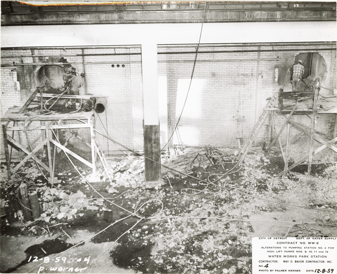 View of workers enlarging existing holes for discharge piping, pumping station no. 2, Waterworks Park, Detroit water supply system. Printed on front: "City of Detroit. Dept. of Water Supply. Contract no. WW-8. Alterations to pumping station no. 2 for high lift pumps nos. 9, 10, 11 and 12. Water Works Park Station. Contractor: Ray D. Baker contractor, Inc. No. 4. Date: 12-8-59. Photo by Palmer Werner." Typed on back: "Enlarging existing holes for discharge piping in north wall of pump house #2."