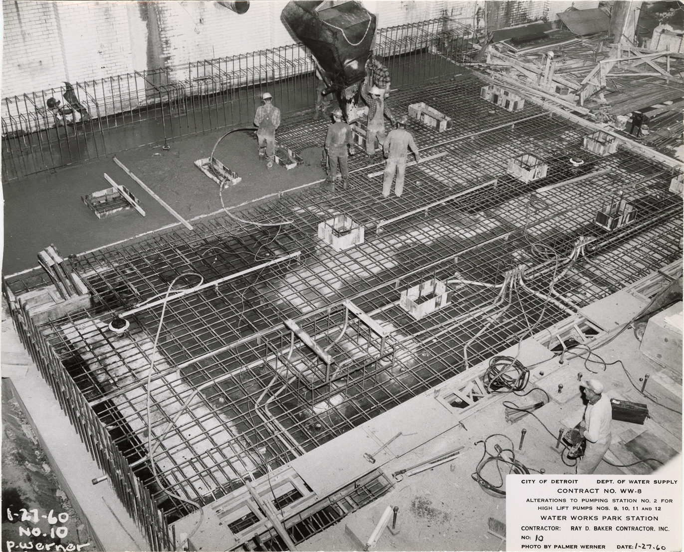 View of workers pouring concrete floor slab, pumping station no. 2, Waterworks Park, Detroit water supply system. Printed on front: "City of Detroit. Dept. of Water Supply. Contract no. WW-8. Alterations to pumping station no. 2 for high lift pumps nos. 9, 10, 11 and 12. Water Works Park Station. Contractor: Ray D. Baker contractor, Inc. No. 10. Date: 1-27-60. Photo by Palmer Werner." Typed on back: "Pouring concrete floor slab at elev. 83'-6" between pump valve bases & north wall."