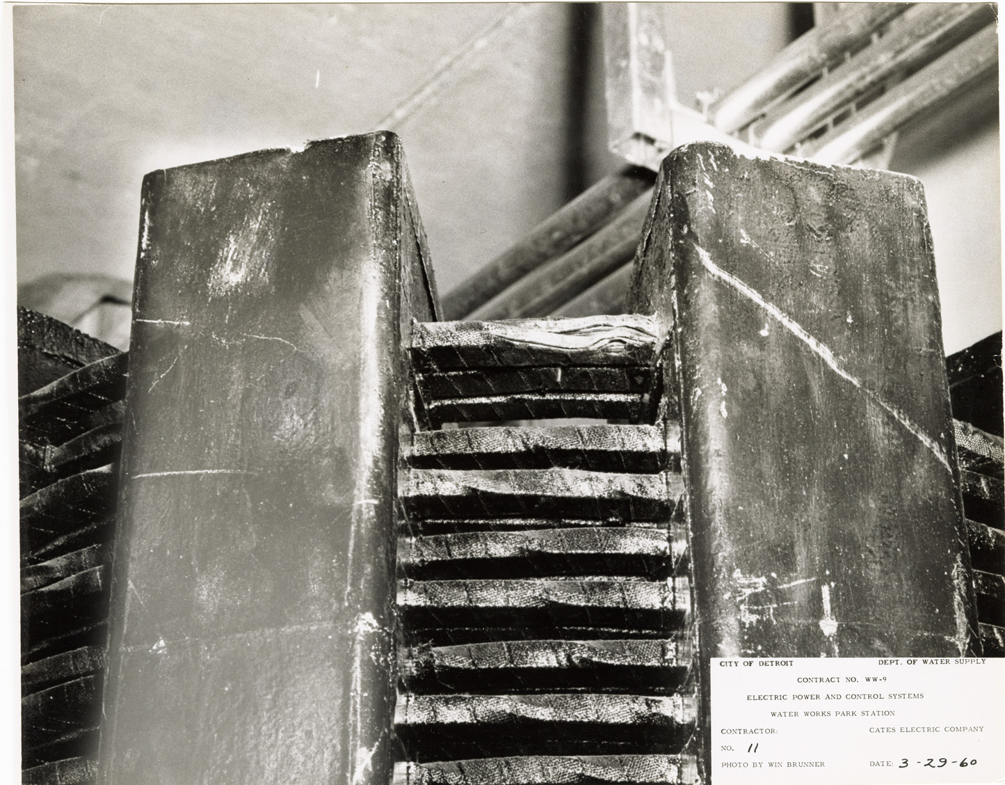 View of damage to top of reactor no. 2, Waterworks Park, Detroit water supply system. Printed on front: "City of Detroit. Dept. of Water Supply. Contract no. WW-9. Electric power and control systems. Water Works Park Station. Contractor: Cates Electric Company. No. 11. Date: 3-29-60. Photo by Win Brunner." Typed on back: "Photograph no. 11. Contract no. WW-9. Damage to top of winding of current limiting reactor no. 2."