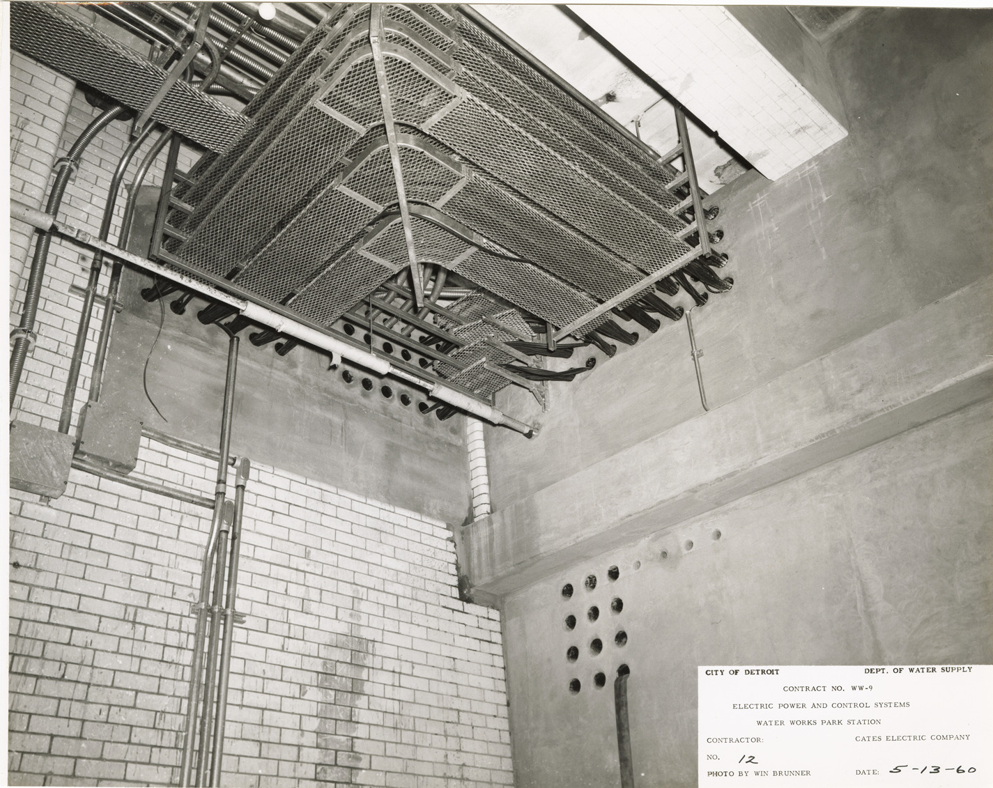 View of cable trays and supports at corner of flood wall, pumping station no. 2, Waterworks Park, Detroit water supply system. Printed on front: "City of Detroit. Dept. of Water Supply. Contract no. WW-9. Electric power and control systems. Water Works Park Station. Contractor: Cates Electric Company. No. 12. Date: 5-13-60. Photo by Win Brunner." Typed on back: "Photograph no. 12. Contract no. WW-9. Cable tray and sleeve arrange at southeast corner of flood wall."