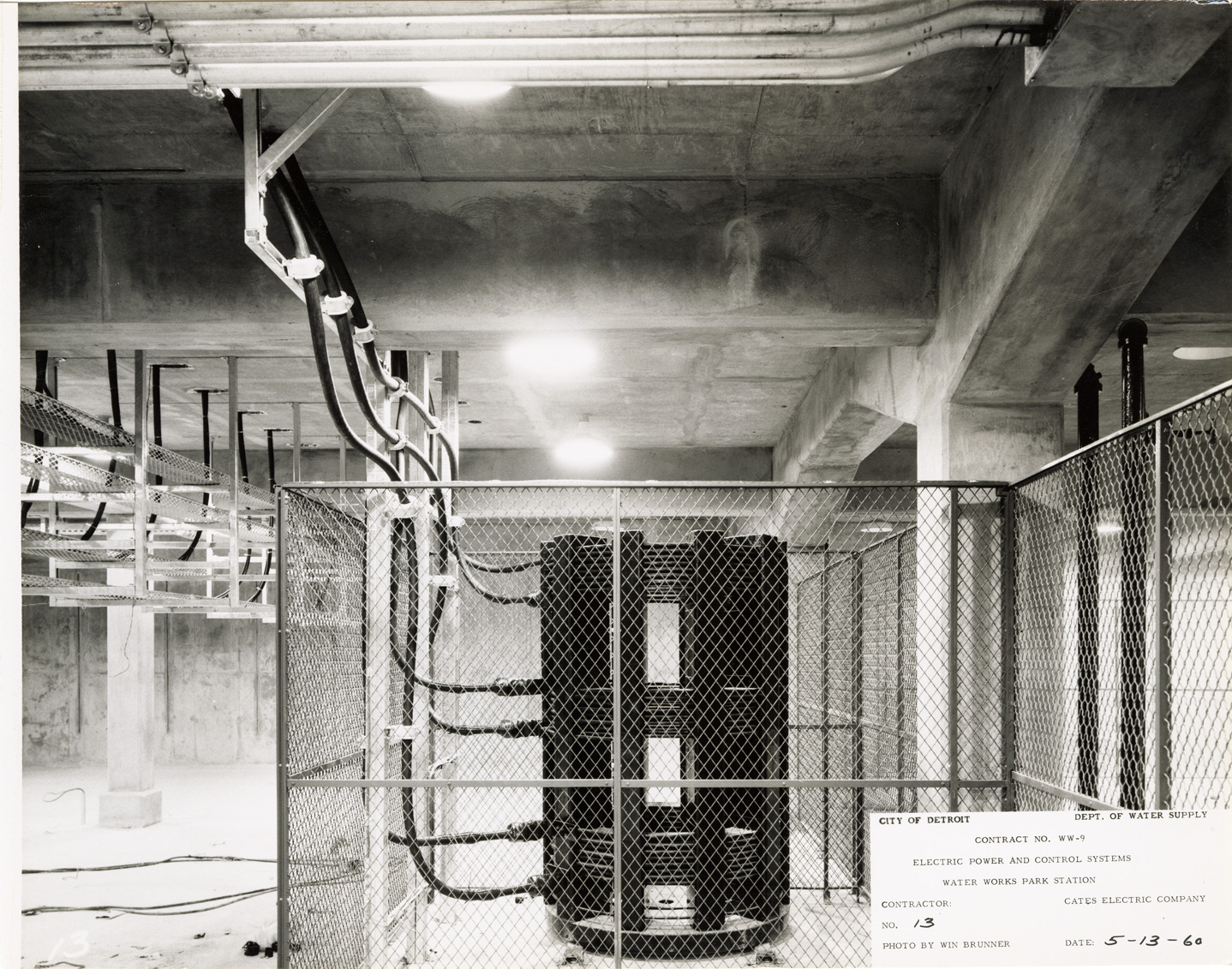 View of reactor no. 3 in switch house basement, Waterworks Park, Detroit water supply system. Printed on front: "City of Detroit. Dept. of Water Supply. Contract no. WW-9. Electric power and control systems. Water Works Park Station. Contractor: Cates Electric Company. No. 13. Date: 5-13-60. Photo by Win Brunner." Typed on back: "Photograph no. 13. Contract no. WW-9. Reactor no. 3 in switch house basement."