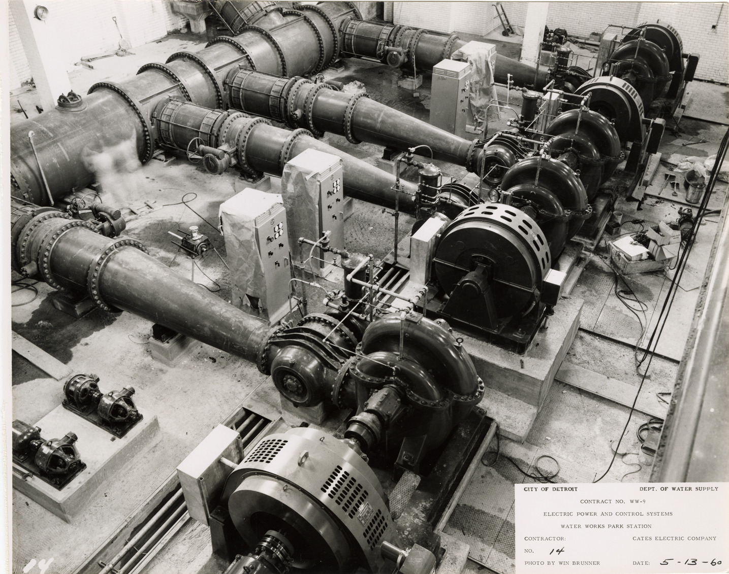 View of pumps, Waterworks Park, Detroit water supply system. Printed on front: "City of Detroit. Dept. of Water Supply. Contract no. WW-9. Electric power and control systems. Water Works Park Station. Contractor: Cates Electric Company. No. 14. Date: 5-13-60. Photo by Win Brunner." Typed on back: "Photograph no. 14. Contract no. WW-9. Pump operating floor. Taken from balcony over southeast corner of flood wall."