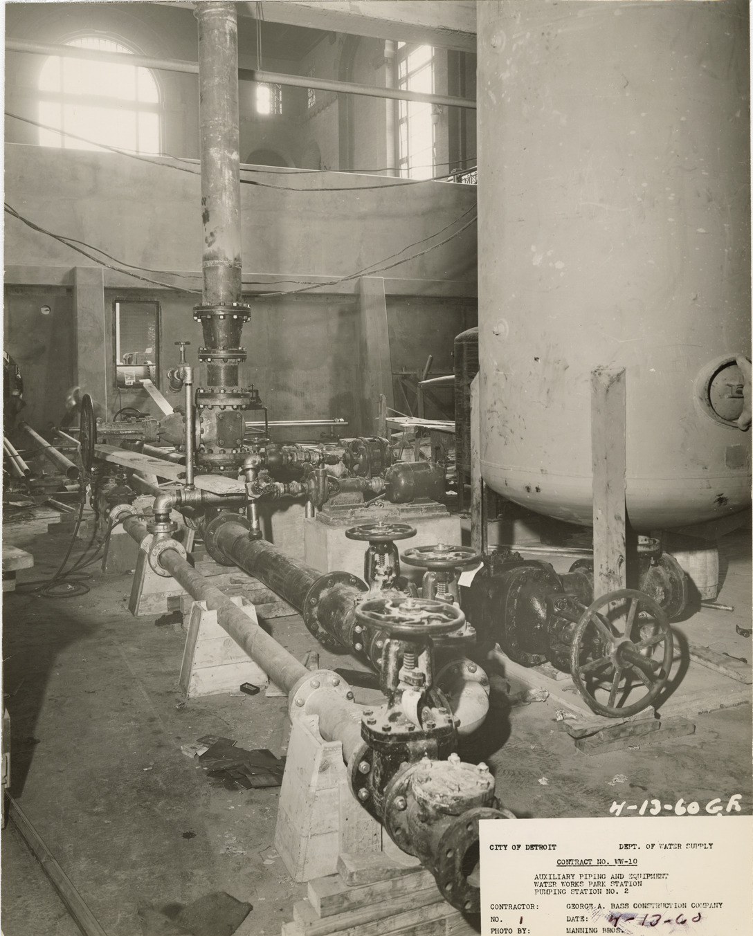 View of tanks, valves, pumps and pipes, pumping station no. 2, Waterworks Park, Detroit water supply system. Printed on front: "City of Detroit. Dept. of Water Supply. Contract no. WW-10. Auxiliary piping and equipment. Water Works Park Station. Pumping station no. 2. Contractor: George A. Bass Construction Company. No. 1. Date: 4-13-60. Photo by Manning Bros." Typed on back: "Photograph no. 1. WW-10. Northwest view of tanks, pumps, valves and piping partially installed."