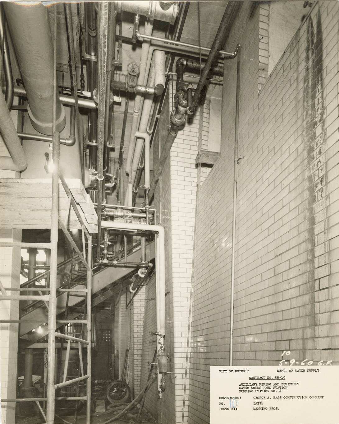 View of water line under existing stairway, pumping station no. 2, Waterworks Park, Detroit water supply system. Printed on front: "City of Detroit. Dept. of Water Supply. Contract no. WW-10. Auxiliary piping and equipment. Water Works Park Station. Pumping station no. 2. Contractor: George A. Bass Construction Company. No. 10. Date: [blank]. Photo by Manning Bros. 5-9-60." Typed on back: "Photograph no. 10. Contract no. WW-10. View looking east at south wall showing 4" water line under existing stairway. Also shows connection to 3" line in pipe tunnel and existing 2" line along south wall."
