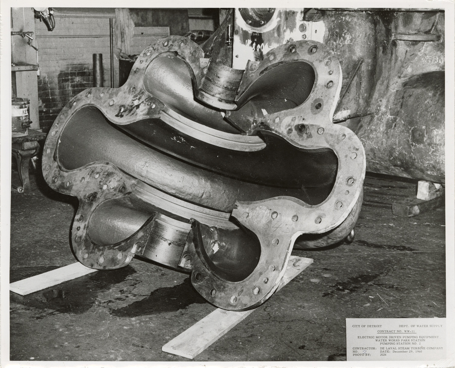 View of upper casing for pump, pumping station no. 2, Waterworks Park, Detroit water supply system. Printed on front: "City of Detroit. Dept. of Water Supply. Contract no. WW-11. Electric motor driven pumping equipment. Water Works Park Station. Pumping station no. 2. Contractor: De Laval Steam Turbine Company. No. 2. Date: December 29, 1960. Photo by: JGN." Typed on back: "Contract no. WW-11. Photo #2. Upper casing."