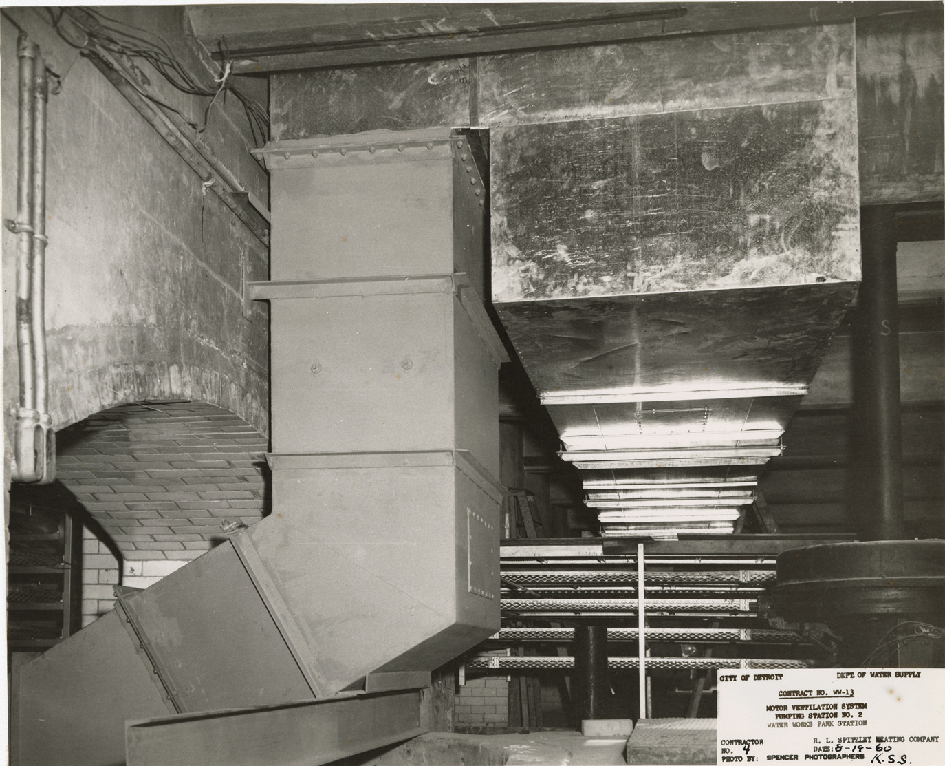 View of ductwork, pumping station no. 2, Waterworks Park, Detroit water supply system. Printed on front: "City of Detroit. Dept. of Water Supply. Contract no. WW-13. Motor ventilation system. Pumping station no. 2. Water Works Park Station. Contractor: R.L. Spitzley Heating Company. No. 4. Date: 8-19-60. Photo by: Spencer Photographers. K.S.S." Typed on back: "Contract no. WW-13. Photograph no. 4. Looking east at welded wall duct and galv. sheet metal duct from fan units." Stamped on back: "Spencer Photographers. 1200 United Artists Bldg. Detroit 26, Mich."