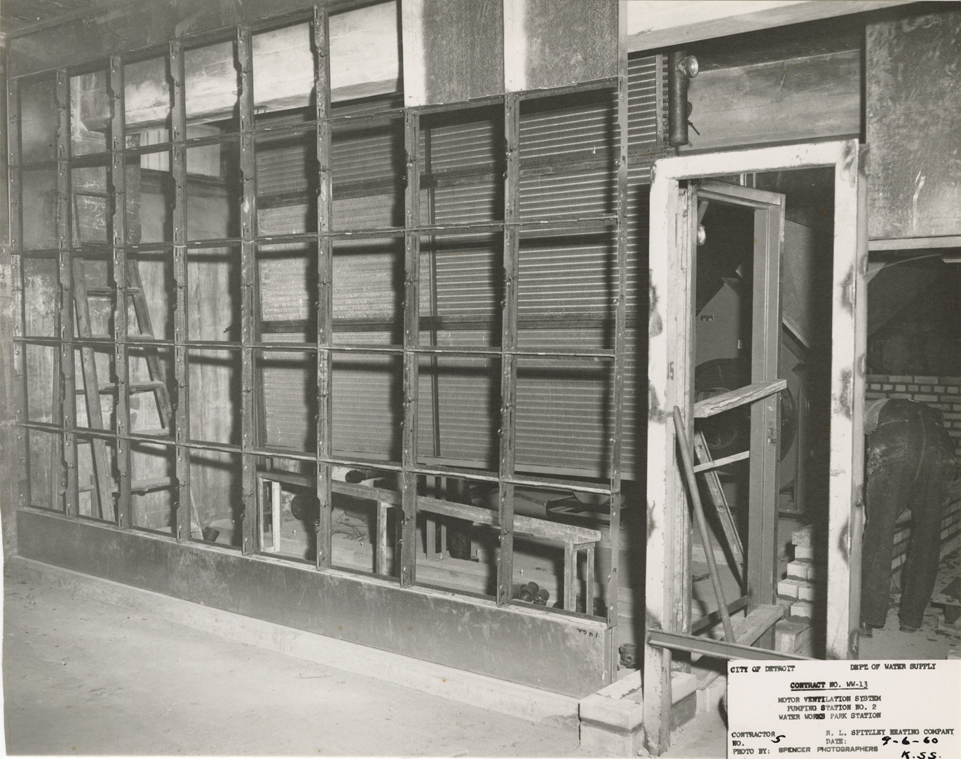 View of holding frames for air filter bank, pumping station no. 2, Waterworks Park, Detroit water supply system. Printed on front: "City of Detroit. Dept. of Water Supply. Contract no. WW-13. Motor ventilation system. Pumping station no. 2. Water Works Park Station. Contractor: R.L. Spitzley Heating Company. No. 5. Date: 9-6-60. Photo by: Spencer Photographers. K.S.S." Typed on back: "Contract no. WW-13. Photograph no. 5. Holding frames for air filter bank & heating coils in the background." Stamped on back: "Spencer Photographers. 1200 United Artists Bldg. Detroit 26, Mich."