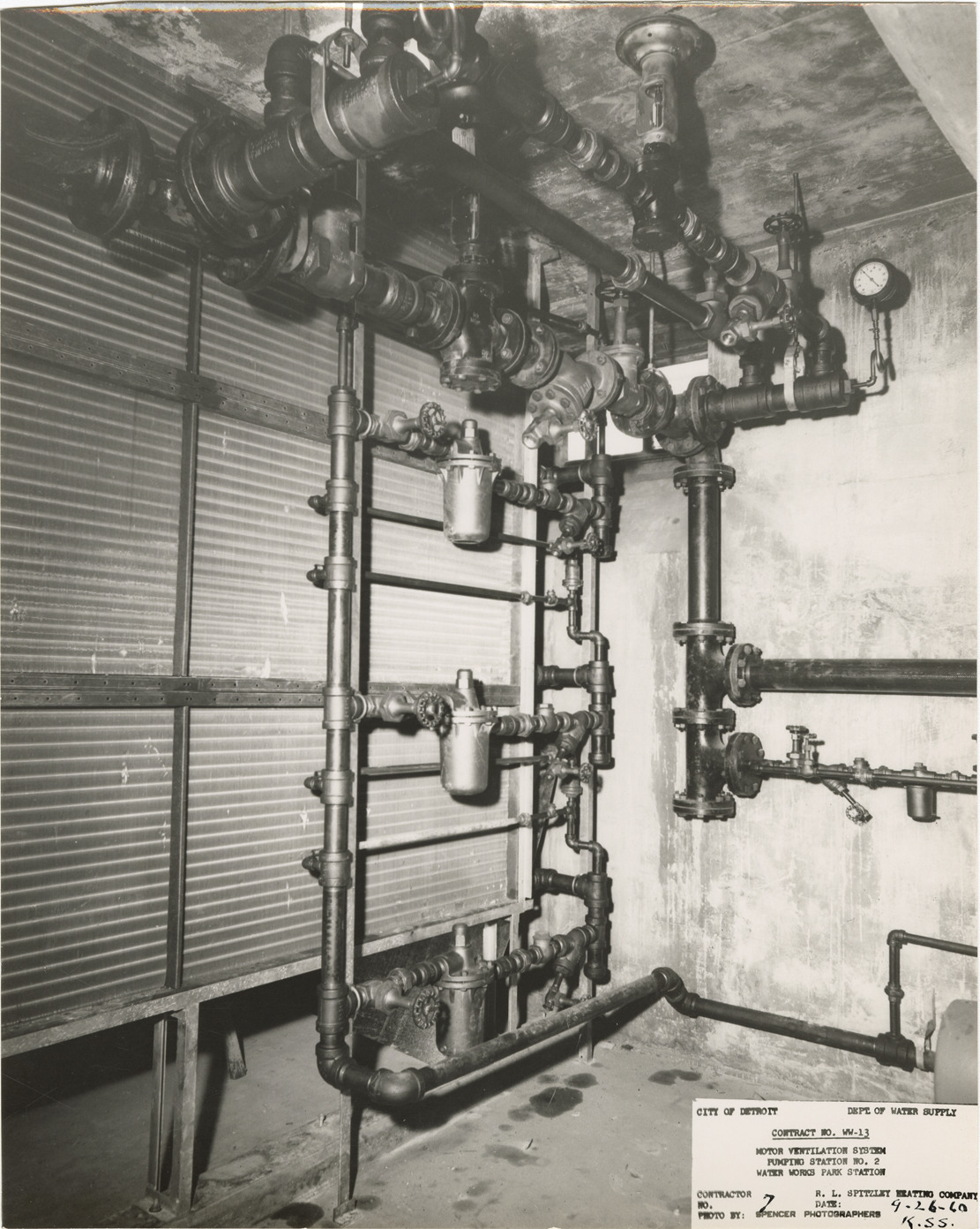View of steam piping and control valves, pumping station no. 2, Waterworks Park, Detroit water supply system. Printed on front: "City of Detroit. Dept. of Water Supply. Contract no. WW-13. Motor ventilation system. Pumping station no. 2. Water Works Park Station. Contractor: R.L. Spitzley Heating Company. No. 7. Date: 9-26-60. Photo by: Spencer Photographers. K.S.S." Typed on back: "Contract no. WW-13. Photograph no. 7. 4" steam piping & control valves and 2" condensate piping, valves, traps and strainers." Stamped on back: "Spencer Photographers. 1200 United Artists Bldg. Detroit 26, Mich."