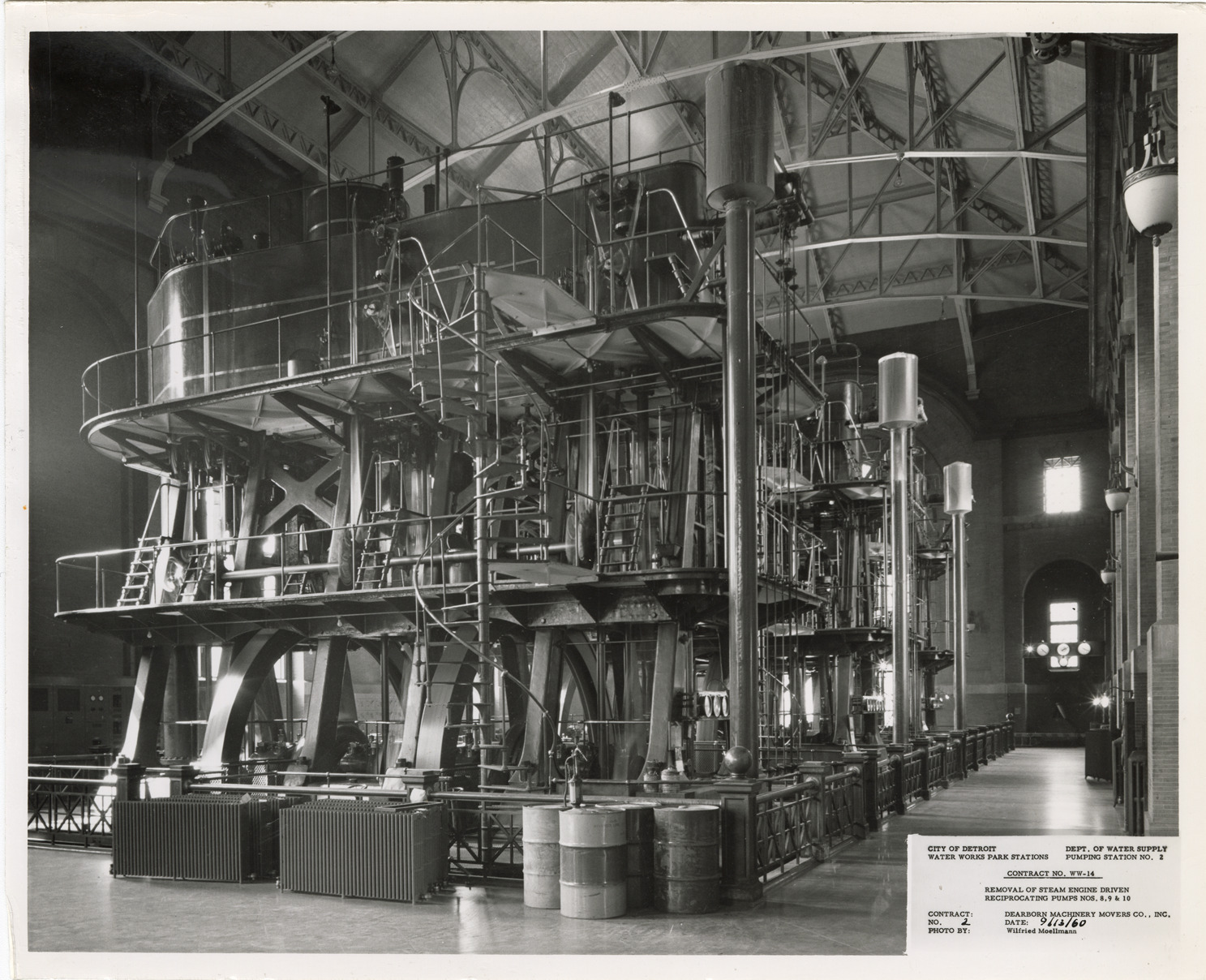 View of pump no. 8, no. 9 and no. 10, pumping station no. 2, Waterworks Park, Detroit water supply system. Printed on front: "City of Detroit. Dept. of Water Supply. Water Works Park Stations. Pumping station no. 2. Contract no. WW-14. Removal of steam engine driven reciprocating pumps nos. 8, 9 & 10. Contract: Dearborn Machinery Movers Co., Inc. No. 2. Date: 9-13-60. Photo by: Wilfried Moellmann." Typed on back: "Photo #2. Contract no. WW-14. Pumps #10, 9 and 8 viewed from north center of PS#2."