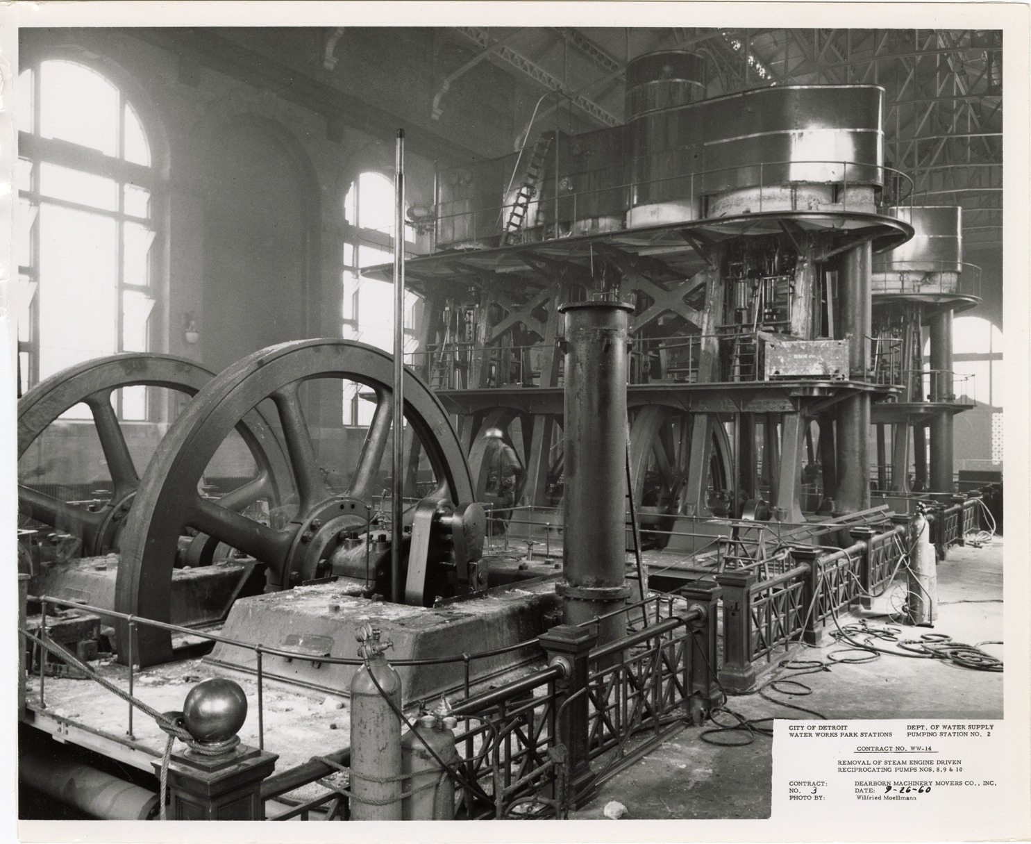 View of pump no. 8, no. 9 and no. 10 being dismantled, pumping station no. 2, Waterworks Park, Detroit water supply system. Printed on front: "City of Detroit. Dept. of Water Supply. Water Works Park Stations. Pumping station no. 2. Contract no. WW-14. Removal of steam engine driven reciprocating pumps nos. 8, 9 & 10. Contract: Dearborn Machinery Movers Co., Inc. No. 3. Date: 9-26-60. Photo by: Wilfried Moellmann." Typed on back: "Photo #3. Contract no. WW-14. Flywheels on pump #8. Pumps #9 & 10 partially dismantled."