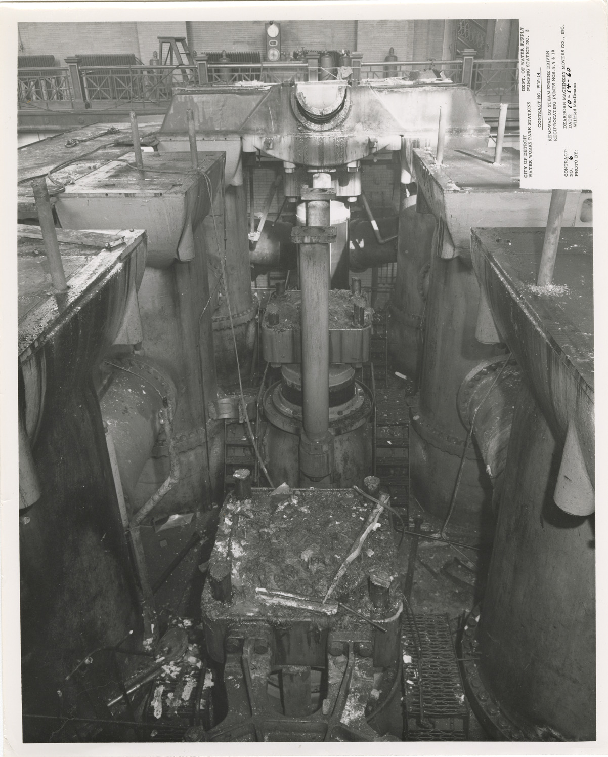 View of pump no. 10 being dismantled, pumping station no. 2, Waterworks Park, Detroit water supply system. Printed on front: "City of Detroit. Dept. of Water Supply. Water Works Park Stations. Pumping station no. 2. Contract no. WW-14. Removal of steam engine driven reciprocating pumps nos. 8, 9 & 10. Contract: Dearborn Machinery Movers Co., Inc. No. 6. Date: 10-14-60. Photo by: Wilfried Moellmann." Typed on back: "Photo #6. Contract no. WW-14. Pumps #10. Cradle for flywheel shaft. Also showing the three pump cylinders and pistons."