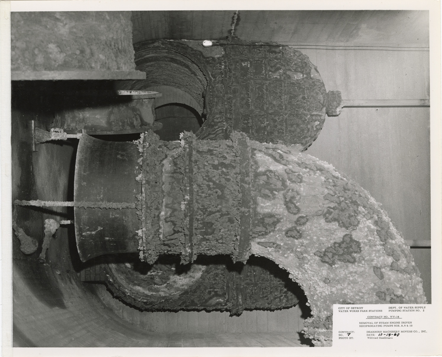 View of suction castings for pump no. 8, pumping station no. 2, Waterworks Park, Detroit water supply system. Printed on front: "City of Detroit. Dept. of Water Supply. Water Works Park Stations. Pumping station no. 2. Contract no. WW-14. Removal of steam engine driven reciprocating pumps nos. 8, 9 & 10. Contract: Dearborn Machinery Movers Co., Inc. No. 7. Date: 10-14-60. Photo by: Wilfried Moellmann." Typed on back: "Photo #7. Contract no. WW-14. Pump #8. Suction castings at west end of center gallery."