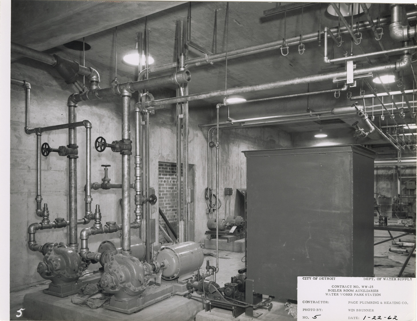 View of boiler feed pumps, chemical pump and tank, Waterworks Park, Detroit water supply system. Printed on front: "City of Detroit. Dept. of Water Supply. Contract no. WW-25. Boiler room auxiliaries. Water Works Park Station. Contractor: Page Plumbing & Heating Co. Photo by: Win Brunner. No. 5. Date: 1-22-62." Typed on back: "Contract no. WW-25. Photo #5. Boiler feed pumps and piping; chemical feed pump, tank and piping; fuel oil pumps in background."