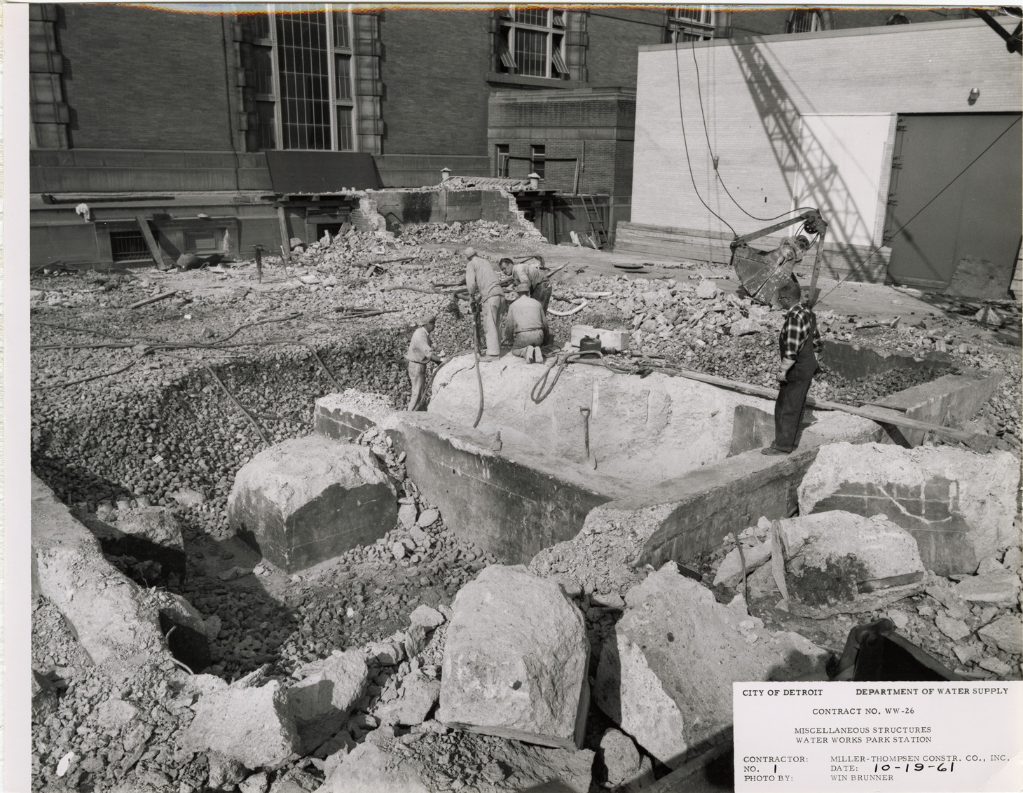 View of workers removing concrete transformer foundations, Waterworks Park, Detroit water supply system. Printed on front: "City of Detroit. Dept. of Water Supply. Contract no. WW-26. Miscellaneous structures. Water Works Park Station. Contractor: Miller-Thompsen Constr. Co., Inc. Photo by: Win Brunner. No. 1. Date: 10-19-61." Typed on back: "Removing existing concrete transformer foundations west of new boiler house."