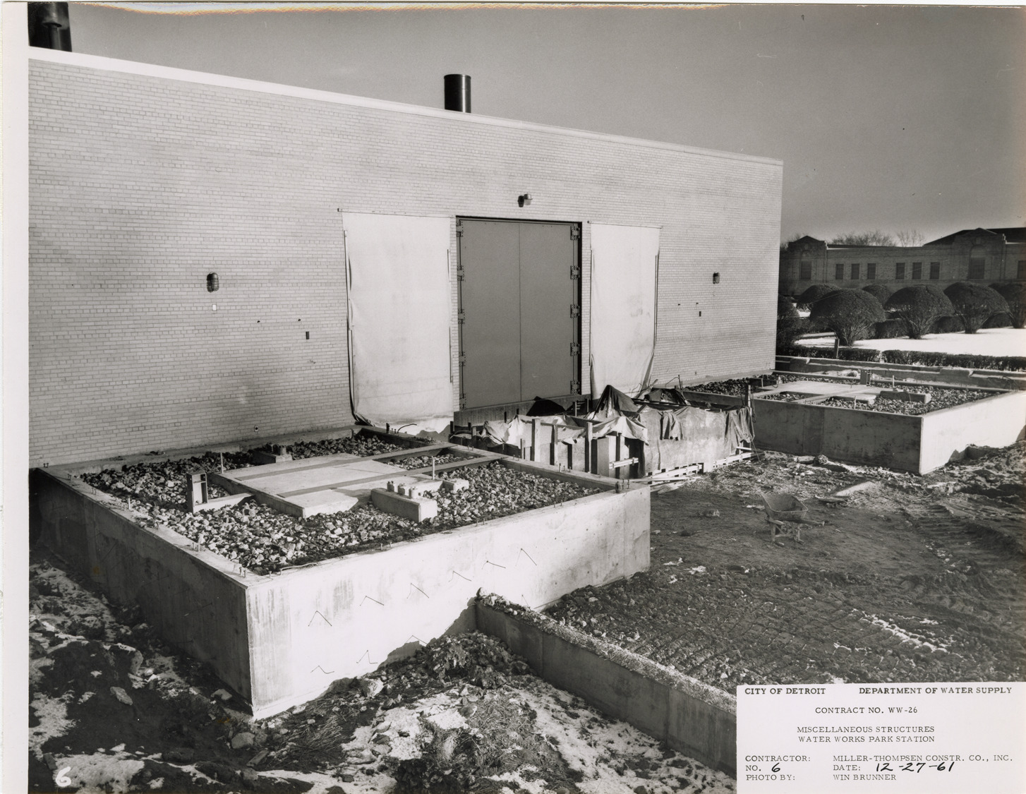View of completed transformer bases at west end of boiler house, Waterworks Park, Detroit water supply system. Printed on front: "City of Detroit. Dept. of Water Supply. Contract no. WW-26. Miscellaneous structures. Water Works Park Station. Contractor: Miller-Thompsen Constr. Co., Inc. Photo by: Win Brunner. No. 6. Date: 12-27-61." Typed on back: "Completed transformer bases at west end of boiler house."