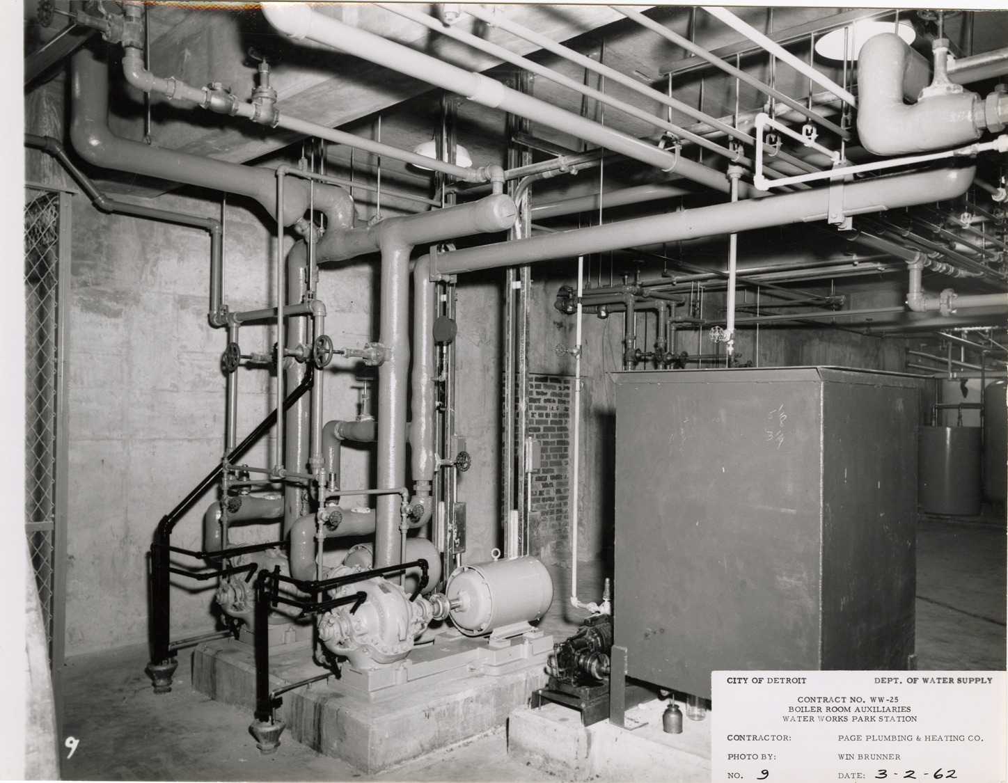 View of boiler feed pumps, chemical pump and tank, Waterworks Park, Detroit water supply system. Printed on front: "City of Detroit. Dept. of Water Supply. Contract no. WW-25. Boiler room auxiliaries. Water Works Park Station. Contractor: Page Plumbing & Heating Co. Photo by: Win Brunner. No. 9. Date: 3-2-62." Typed on back: "Contract no. WW-25. Photo #9. Boiler feed pumps and piping; chemical feed pump, tank & piping; miscellaneous piping."