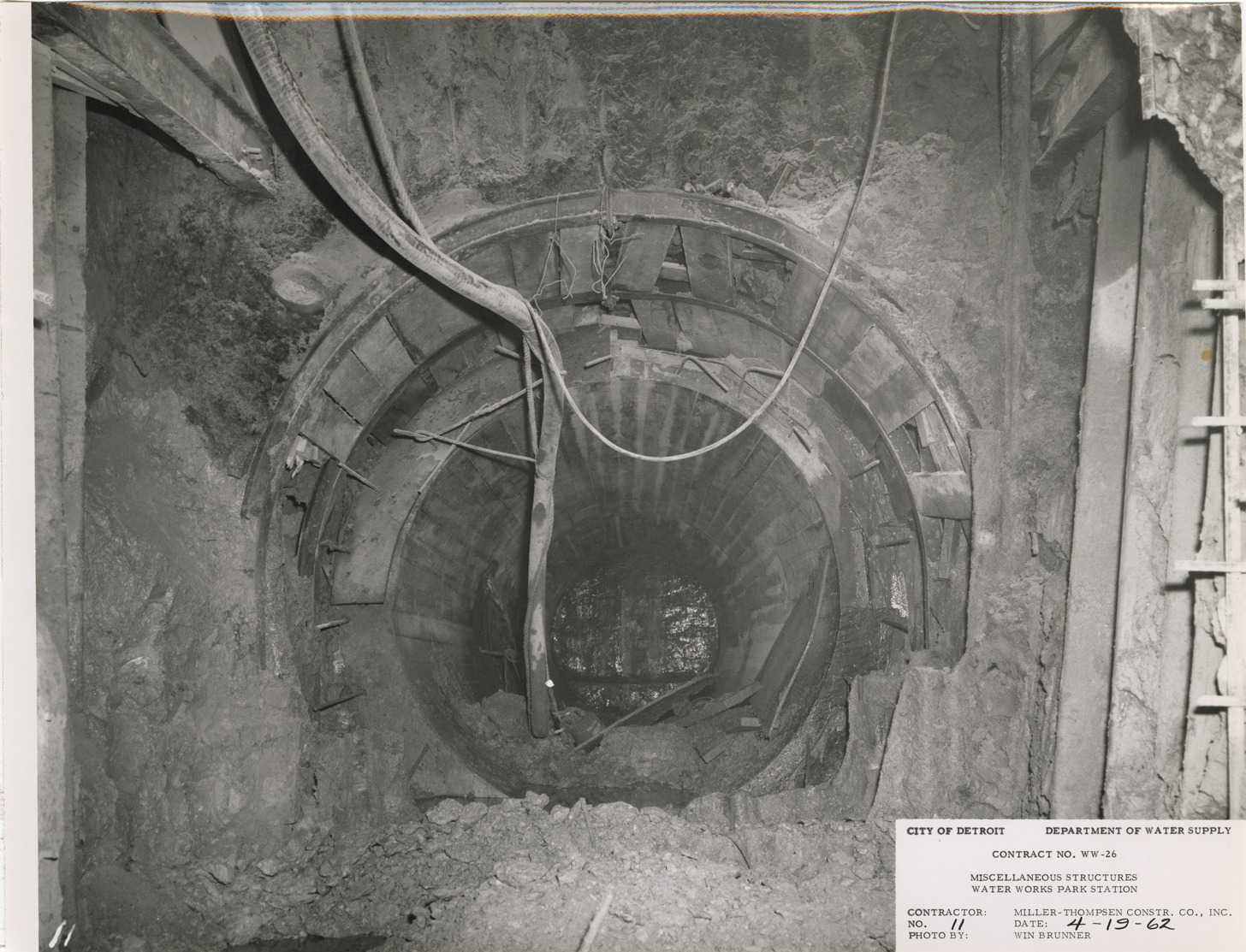 View of concrete tunnel, Waterworks Park, Detroit water supply system. Printed on front: "City of Detroit. Dept. of Water Supply. Contract no. WW-26. Miscellaneous structures. Water Works Park Station. Contractor: Miller-Thompsen Constr. Co., Inc. Photo by: Win Brunner. No. 11. Date: 4-19-62." Typed on back: "Completed portion of 8 ft. diameter concrete tunnel. North wall of reservoir in background."