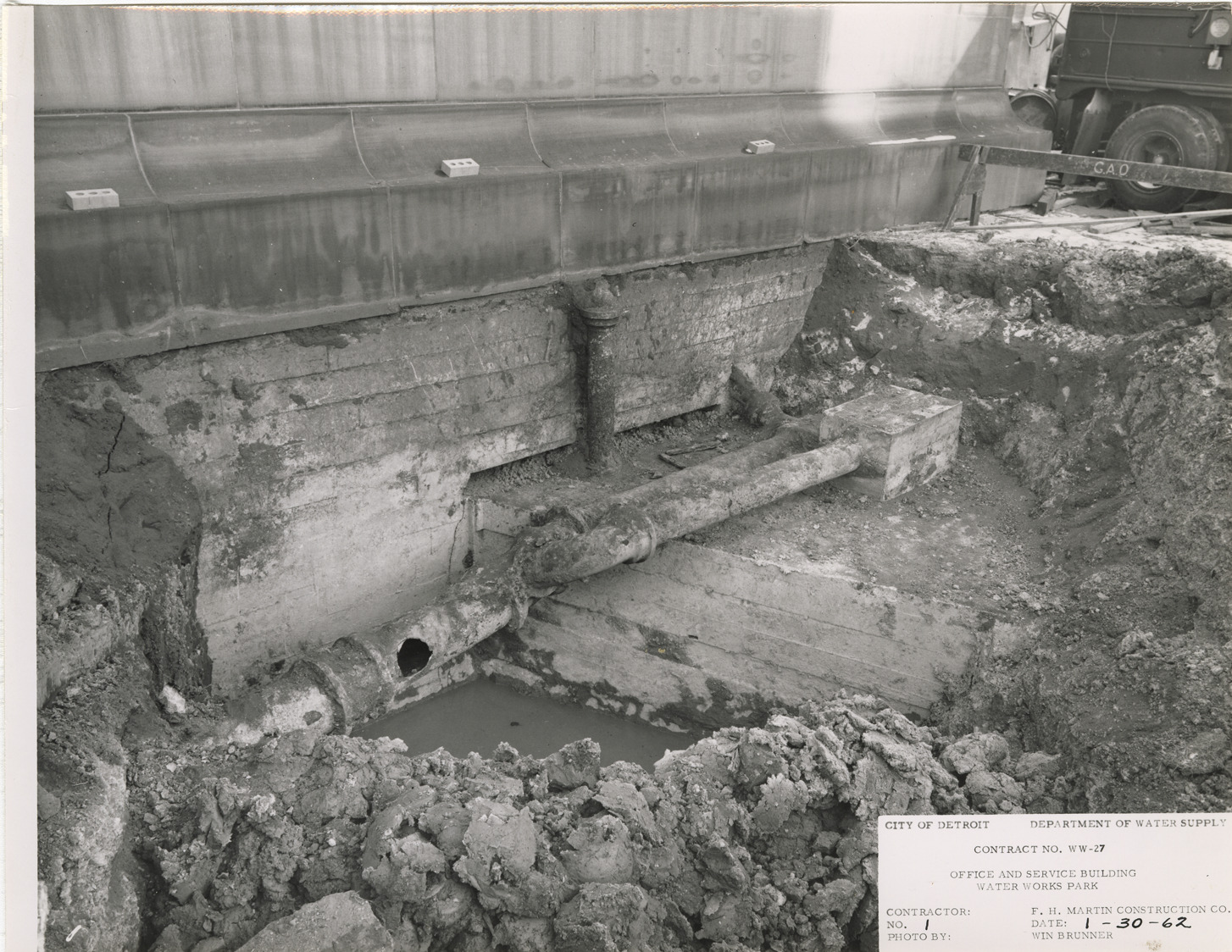 View of cast iron drain pipes over old steam pipe tunnel in pump house no. 2, Waterworks Park, Detroit water supply system. Printed on front: "City of Detroit. Dept. of Water Supply. Contract no. WW-27. Office and service building. Water Works Park Station. Contractor: F.H. Martin Construction Co. Photo by: Win Brunner. No. 1. Date: 1-30-62." Typed on back: "Arrangement of cast iron drain pipes over old steam pipe tunnel at southwest corner of pump house no. 2."