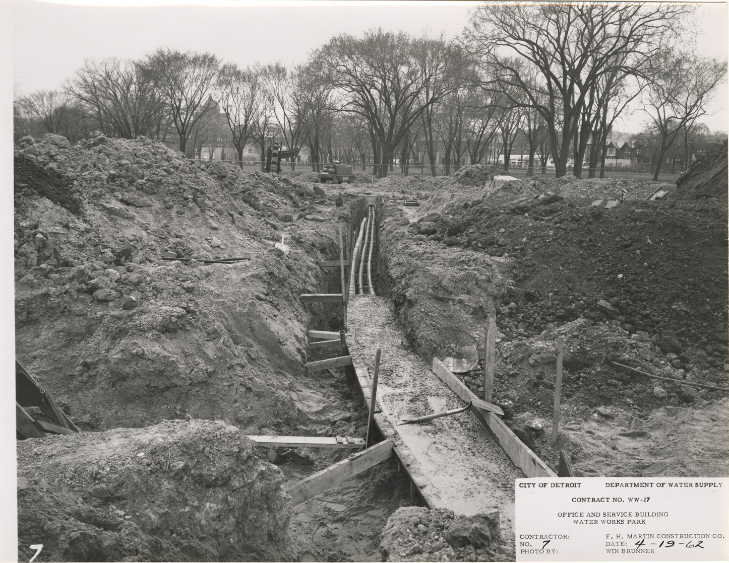View of fiber duct bank for office and service building, Waterworks Park, Detroit water supply system. Printed on front: "City of Detroit. Dept. of Water Supply. Contract no. WW-27. Office and service building. Water Works Park Station. Contractor: F.H. Martin Construction Co. Photo by: Win Brunner. No. 7. Date: 4-19-62." Typed on back: "Fibre duct bank in concrete encasement from west wall of building to existing manhole."