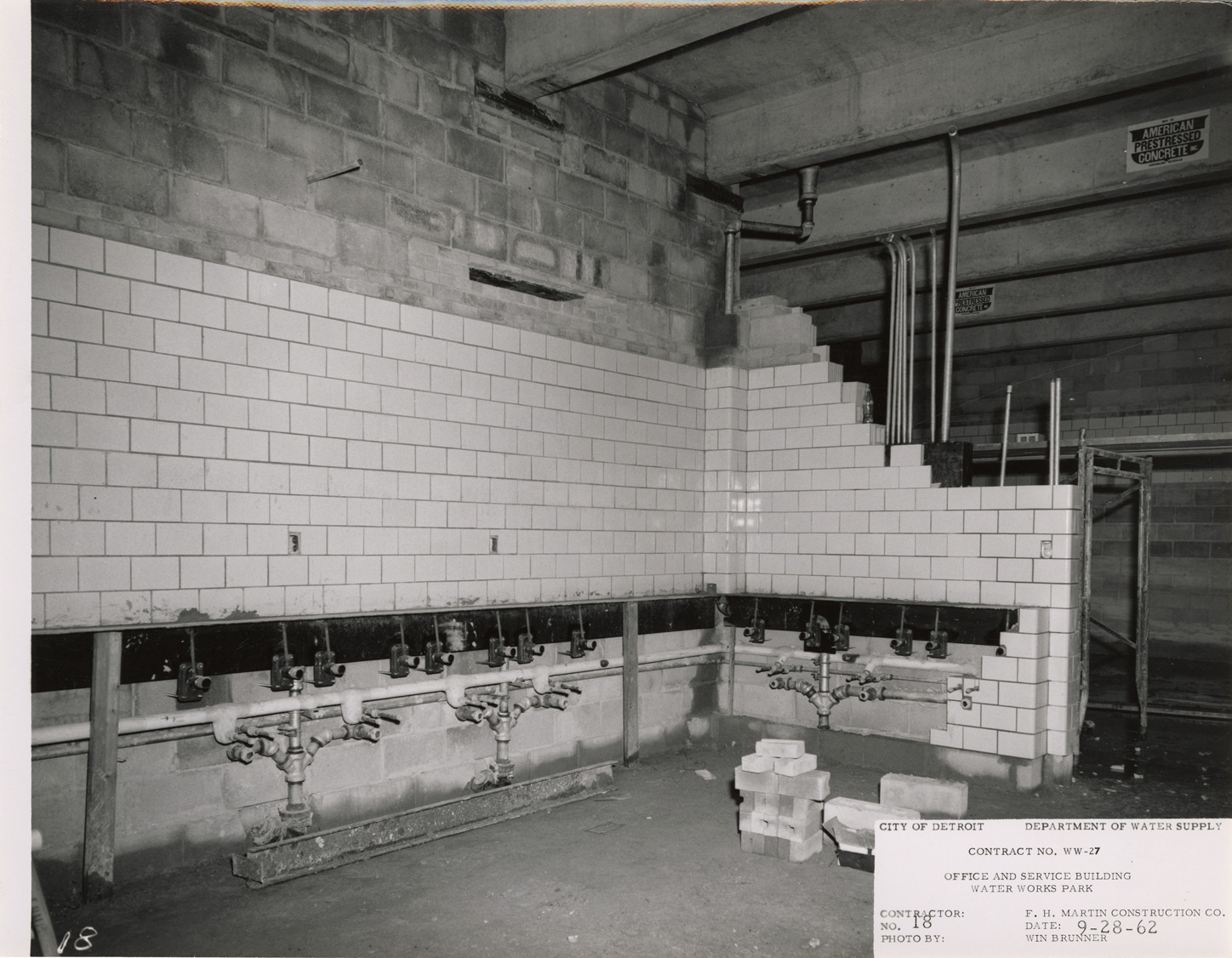 View of lavatory piping and tile in toilet room no. 1, office and service building, Waterworks Park, Detroit water supply system. Printed on front: "City of Detroit. Dept. of Water Supply. Contract no. WW-27. Office and service building. Water Works Park Station. Contractor: F.H. Martin Construction Co. Photo by: Win Brunner. No. 18. Date: 9-28-62." Typed on back: "Structural glazed facing tile and lavatory piping in toilet room no. 1."