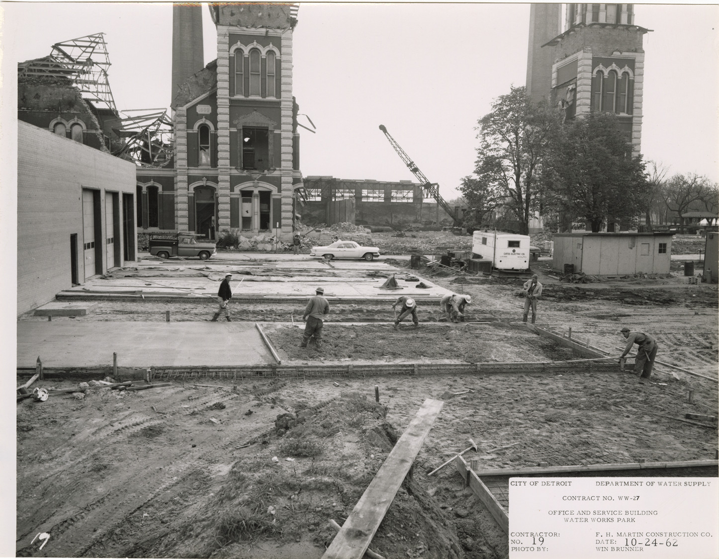 View of workers pouring concrete service drive for office and service building, Waterworks Park, Detroit water supply system. Printed on front: "City of Detroit. Dept. of Water Supply. Contract no. WW-27. Office and service building. Water Works Park Station. Contractor: F.H. Martin Construction Co. Photo by: Win Brunner. No. 19. Date: 10-24-62." Typed on back: "Pouring reinforced concrete service drive."