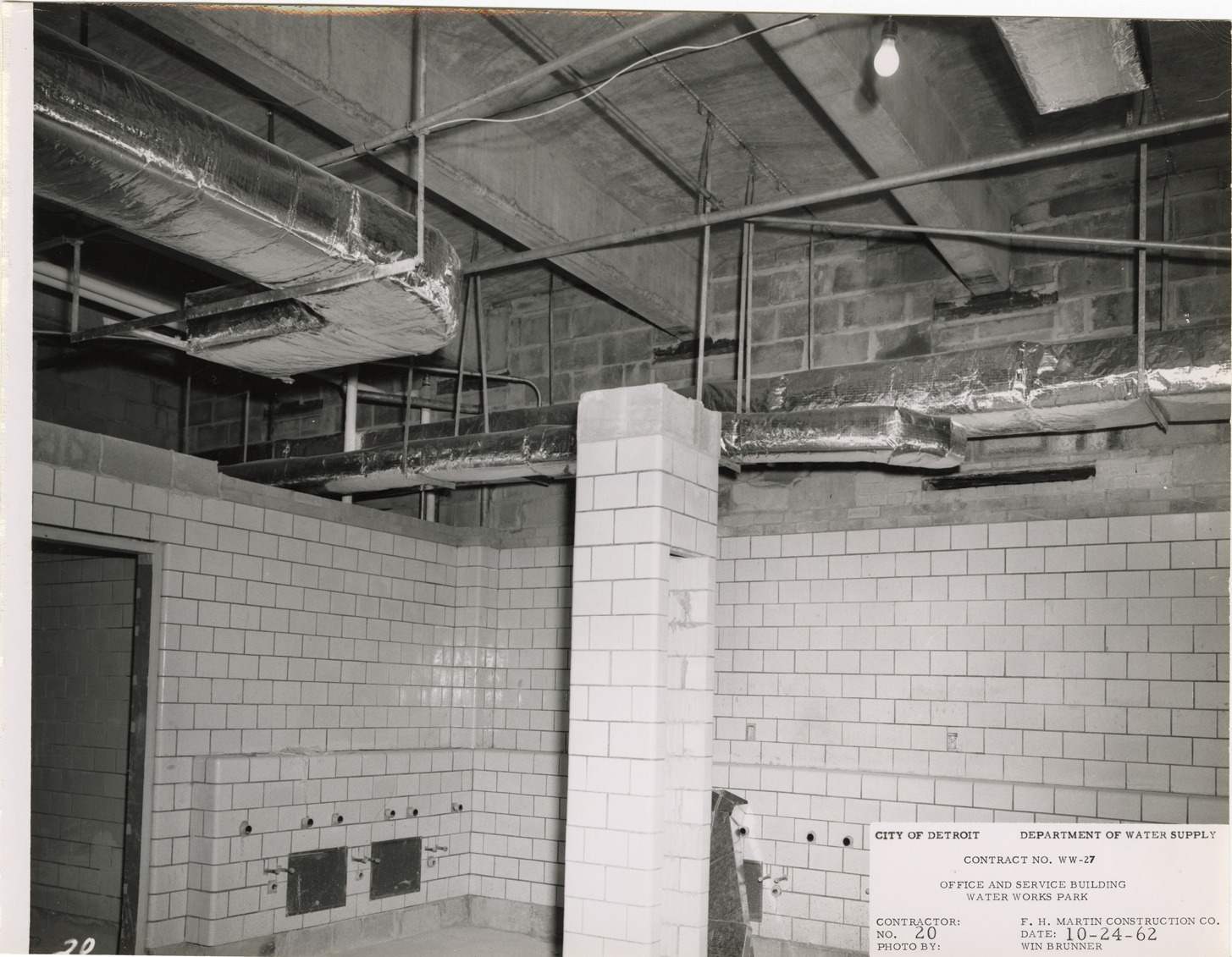 View of insulated ductwork over lavatory for office and service building, Waterworks Park, Detroit water supply system. Printed on front: "City of Detroit. Dept. of Water Supply. Contract no. WW-27. Office and service building. Water Works Park Station. Contractor: F.H. Martin Construction Co. Photo by: Win Brunner. No. 20. Date: 10-24-62." Typed on back: "Insulated duct work above ceiling line in toilet room no. 1."